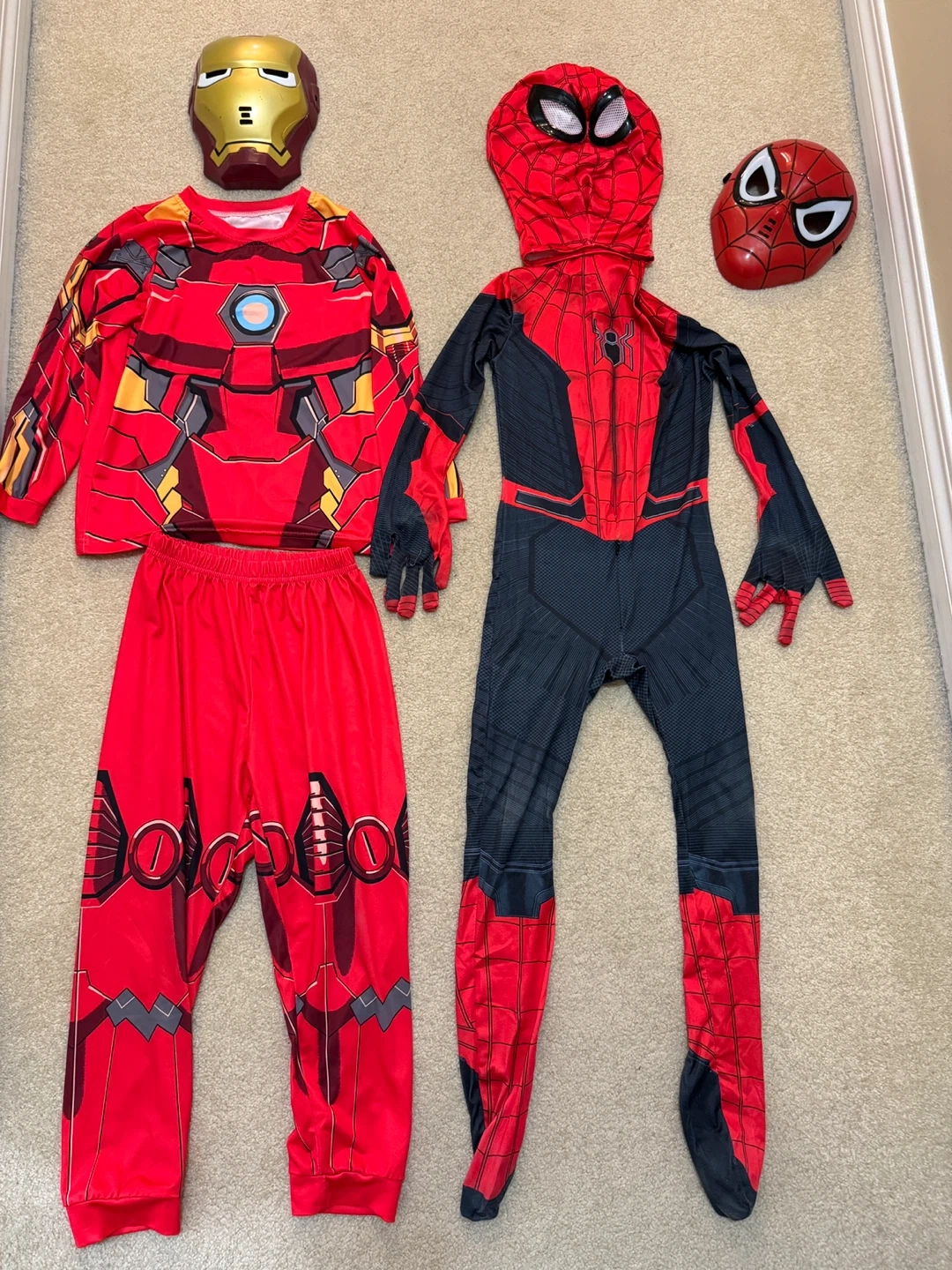 Selling two kids' costumes: Iron Man and Spider-Man! Both are in great shape and ready for a new superhero in training. Includes masks and full body suits for both characters