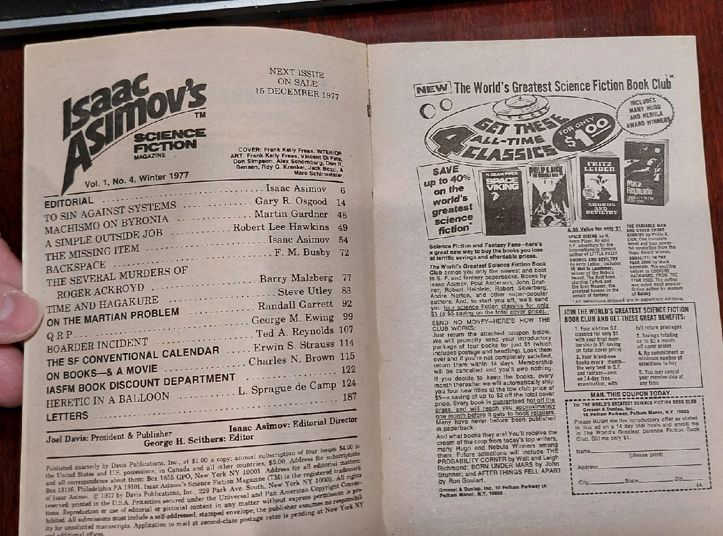 Selling a vintage copy of Isaac Asimov's Science Fiction Magazine from Winter 1977! This magazine is a piece of science fiction history, featuring stories by L. Sprague de Camp, Isaac Asimov, Randall Garrett, and F.M. Busby. It's a great addition to any sci-fi collection