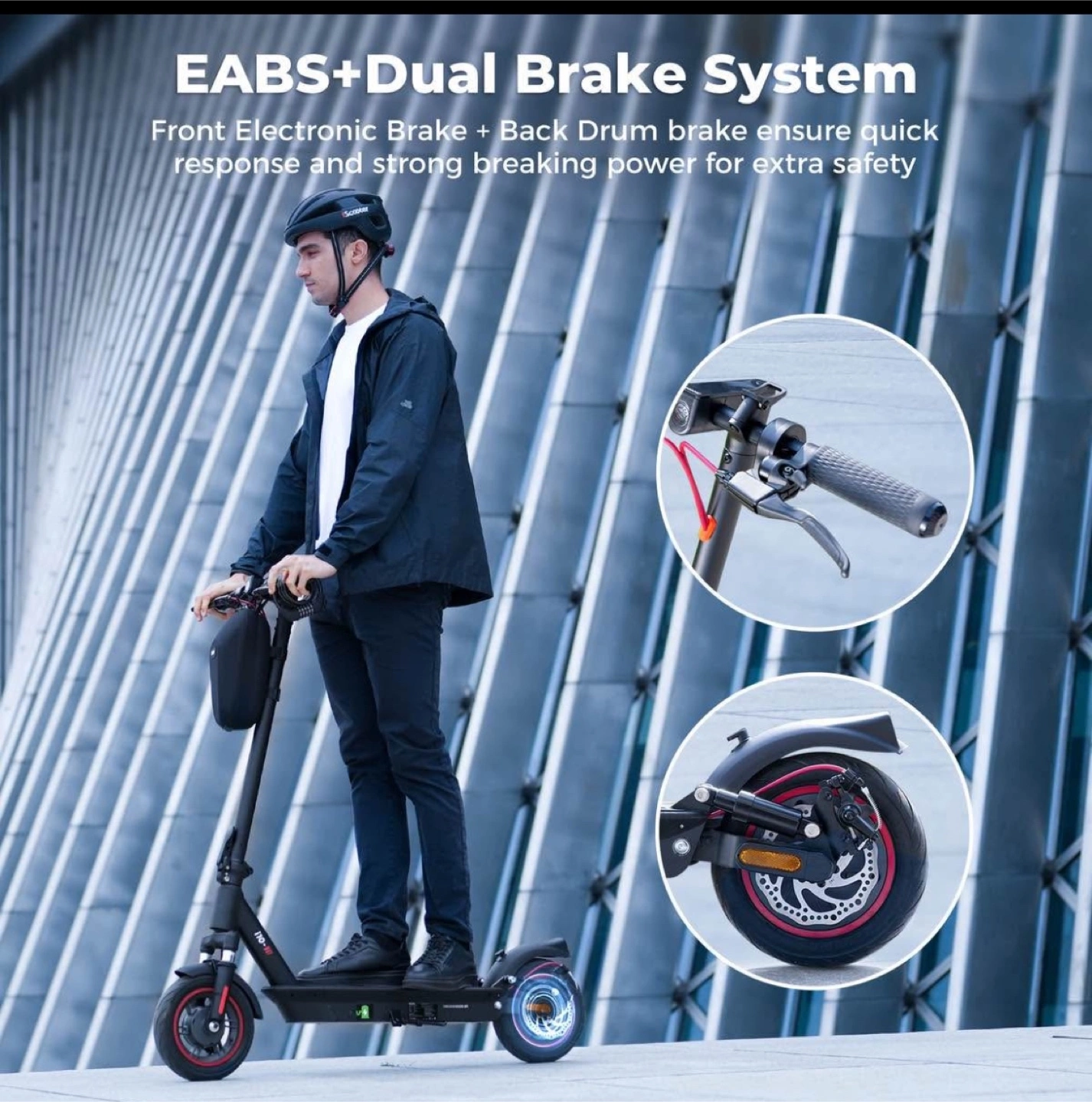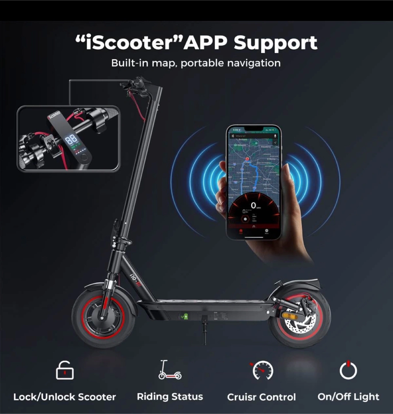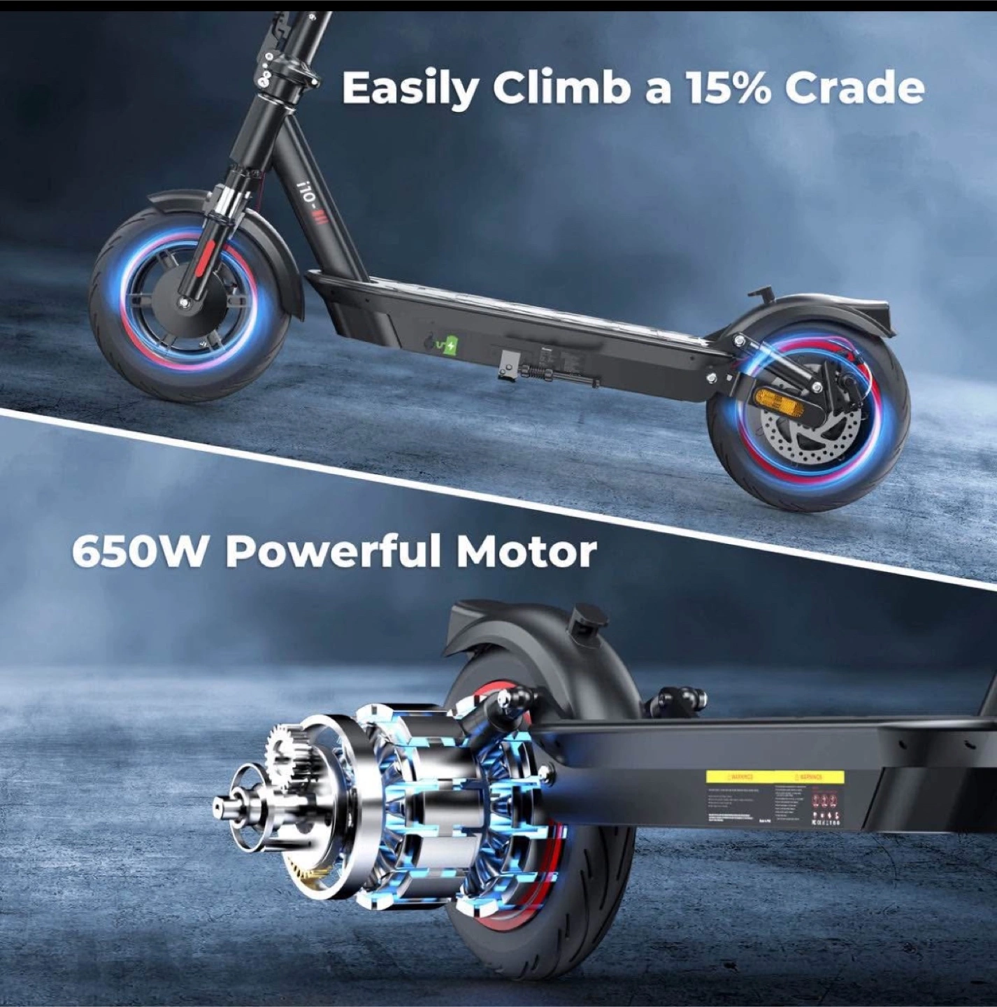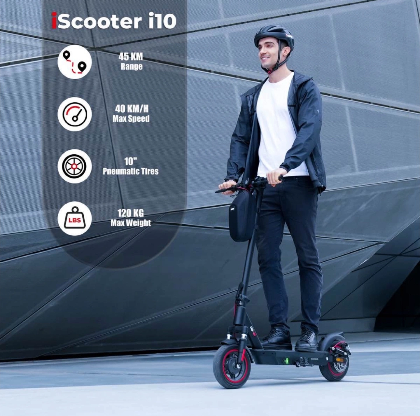 Used-like new. Bought for 900$ and asking $800. Very powerful scooter. iScooter i10 Max review after 1 month : r/ElectricScooters The iScooter i10 electric scooter features a 650W motor, 10-inch pneumatic tires, and a 42V 15Ah battery, offering a top speed of 40 km/h (25 mph) and a range of up to 45 km (28 miles). It includes front and rear suspension, a folding design, an LED display, iScooter app compatibility, and a 120 kg (265 lbs) maximum load capacity. Safety is enhanced with electronic front and rear disc brakes, integrated lights, turn signals, and a durable IP54 waterproof rating. Performance & Battery Motor: 650W brushless motor, capable of climbing 15-20 degree slopes. Top Speed: 40 km/h (25 mph). Battery: 42V 15Ah battery. Max Range: Up to 45 km (28 miles) on a single charge. Charging Time: 6-8 hours. Design & Build Weight: Approximately 20 kg (44 lbs). Tires: 10-inch pneumatic tires for a smoother ride. Suspension: Front and rear suspension for added comfort. Portability: Foldable design for easy storage and transportation. Waterproof Rating: IP54 for water and dust resistance. Safety Features Brakes: EBAS (Electronic Braking Assist System) front brake and a rear disc brake. Lighting: Integrated front headlight and rear brake light. Turn Signals: Built-in turn signals to alert other road users. Smart Features & Convenience Display: Multi-functional LED display for speed, battery life, and more. App Compatibility: Connects to the iScooter app for iOS and Android, providing map navigation. Cruise Control: A setting to maintain speed, reducing rider fatigue. Mudguards: Built-in mudguards to protect the rider from spray and dirt. Specifications Summary Maximum Load Capacity: 120 kg (265 lbs). Recommended Height: 120-200 cm (approx. 3'11" to 6'7"). Folded Dimensions: 11548.554 cm (45.21921.2 inches).