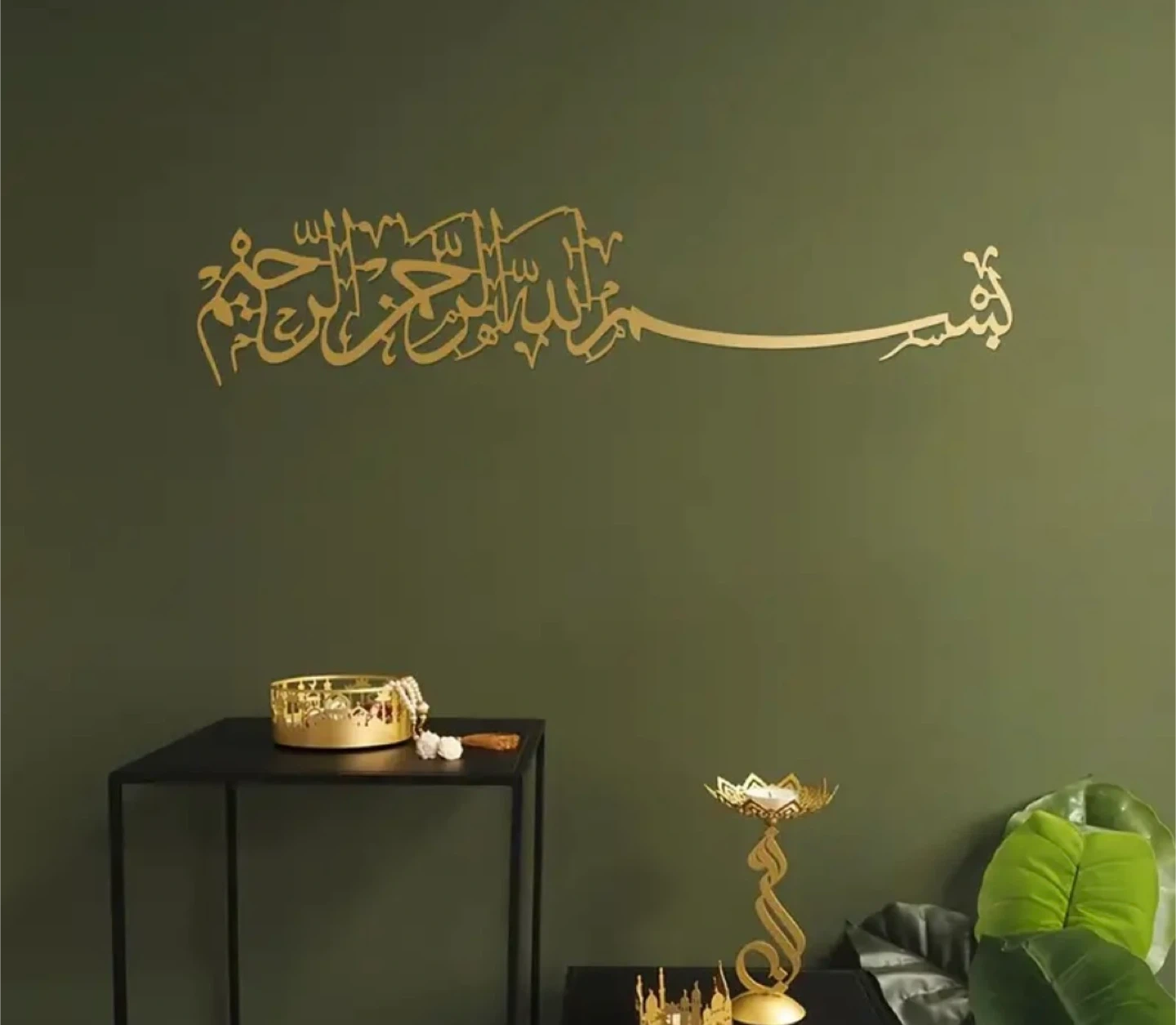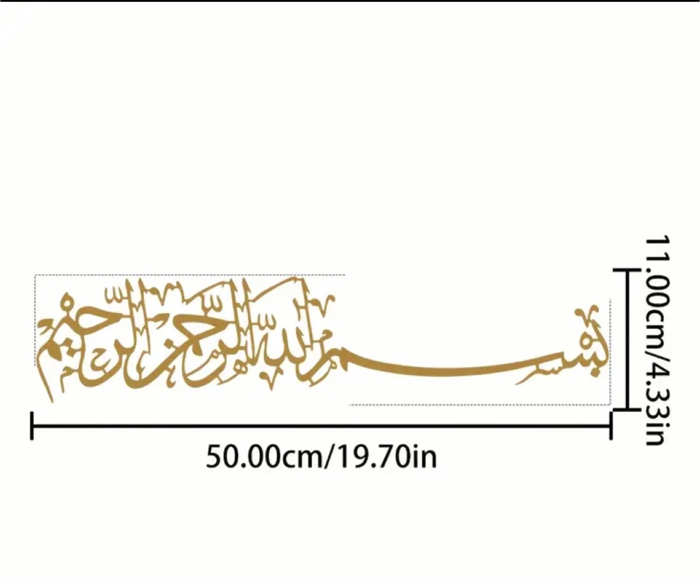 Beautiful Islamic wall art in gold! This calligraphy piece measures approximately 50 cm (19.7 inches) in length and 11 cm (4.33 inches) in height. It's a lovely addition to any home decor