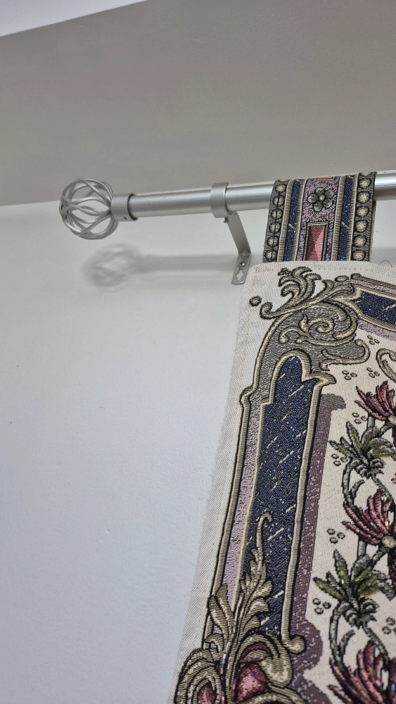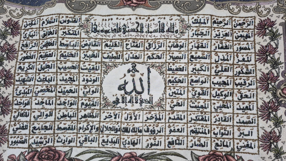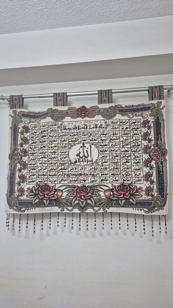 Cloth hanging Islamic wall art. The 99 names of Allah displayed in bead work. Comes with rod for hanging it up.