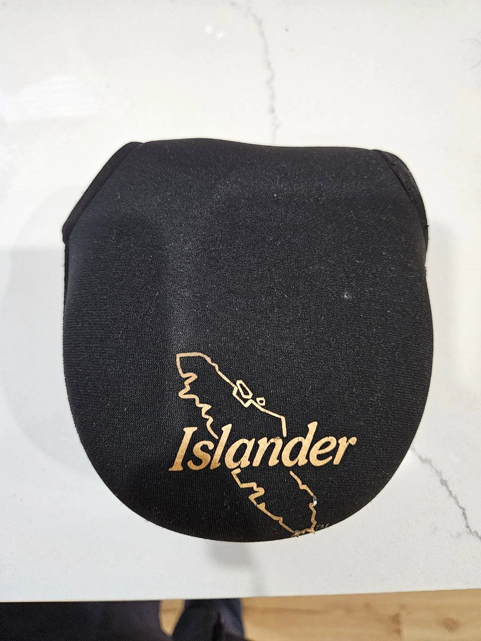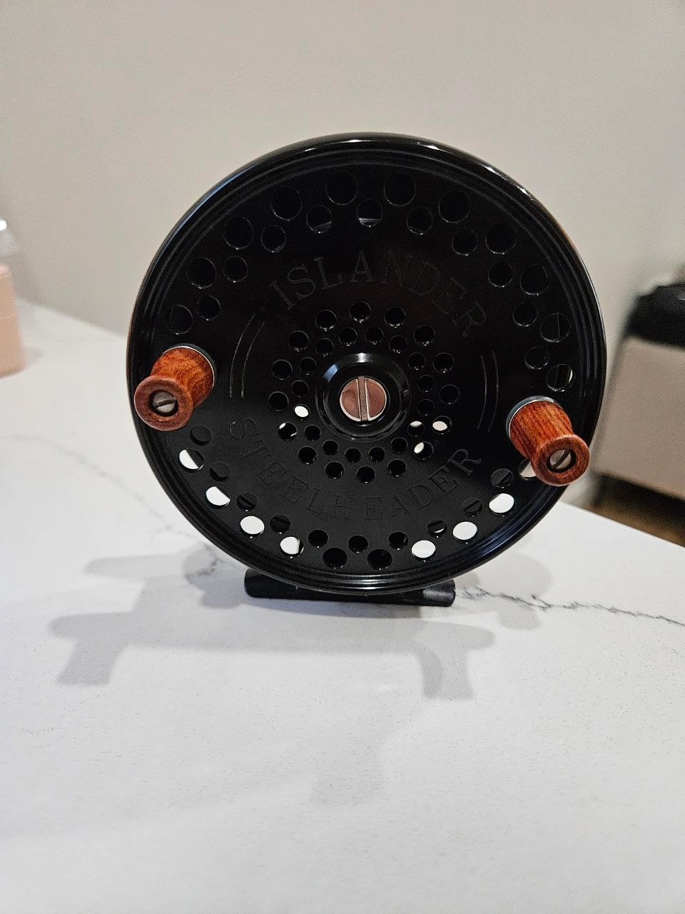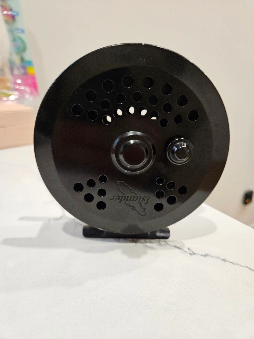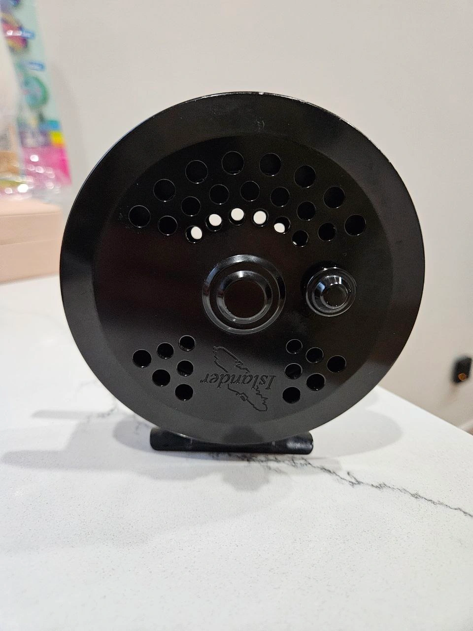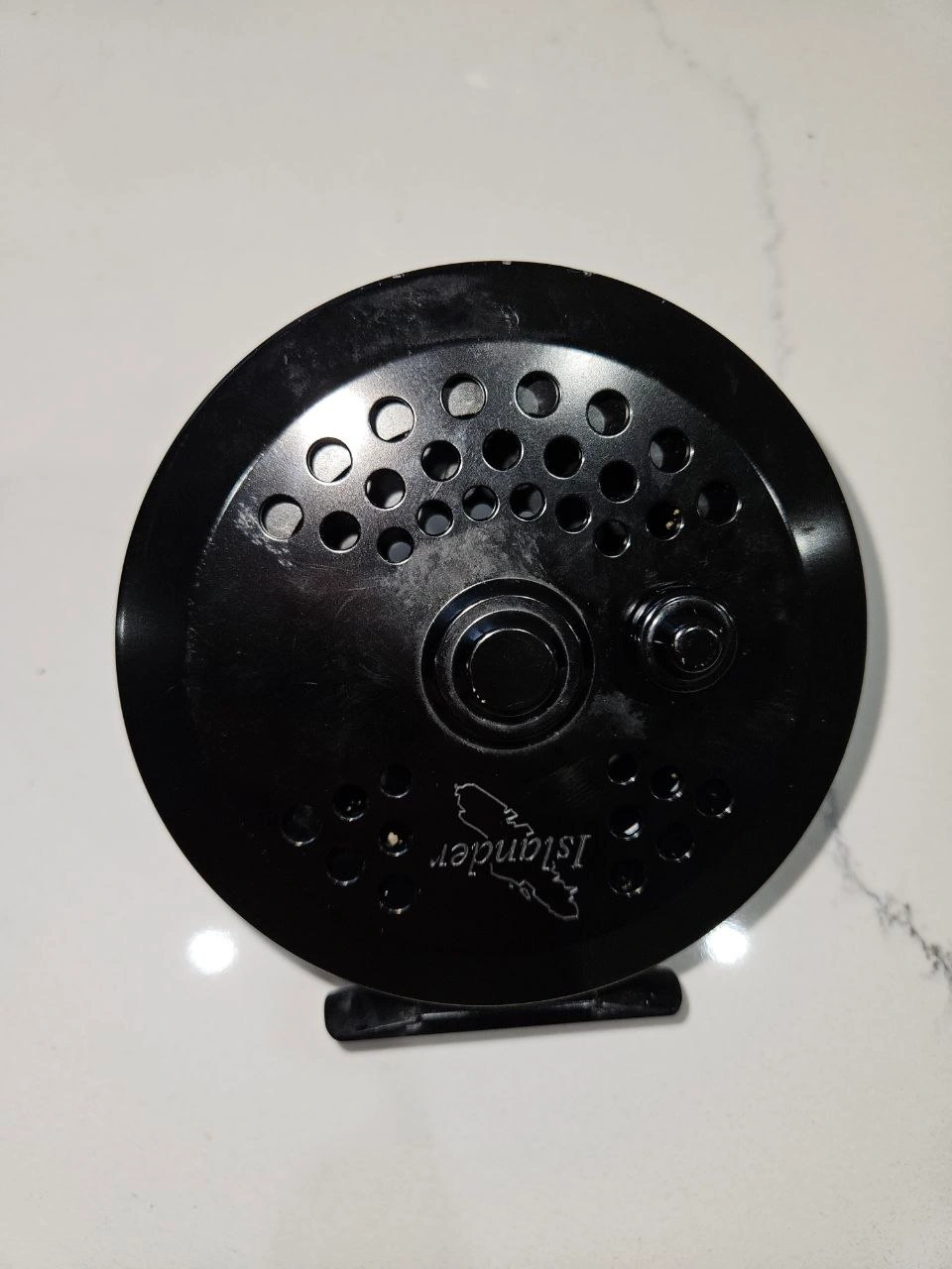 Black Islander fly fishing reel. Includes a black neoprene reel case. Excellent condition.