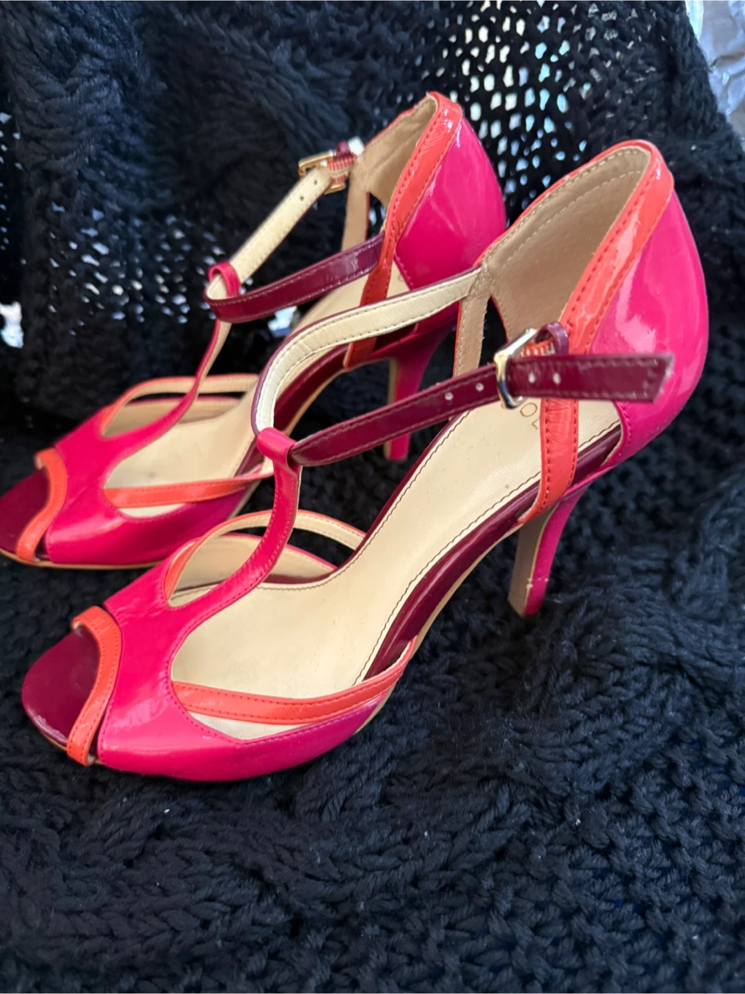 Cute Isola heels in a vibrant pink and orange colour combo! They are a size 9 and have a stylish T-strap design. Perfect for adding a pop of colour to your outfit!
