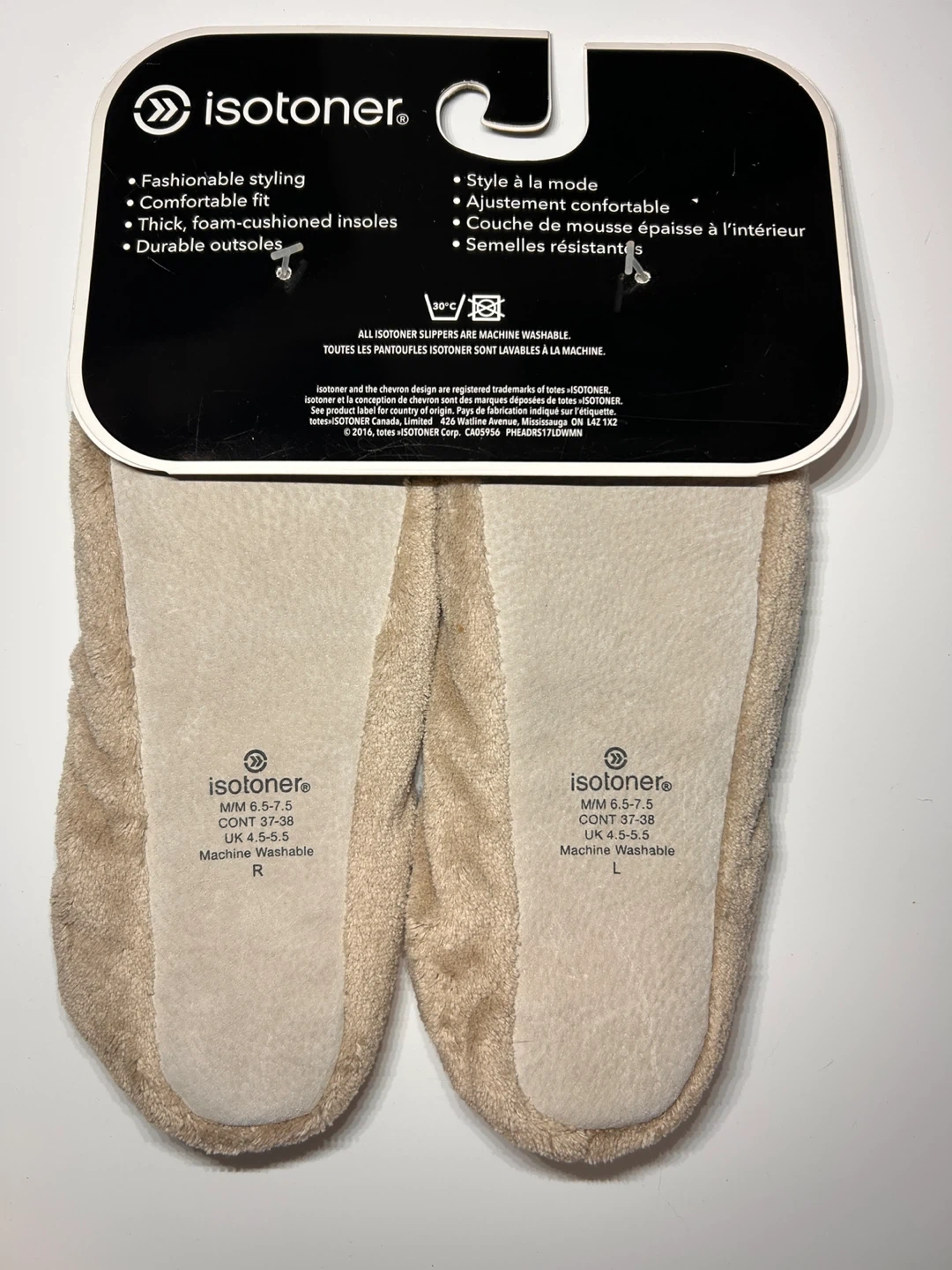 Keep your feet cozy with these Isotoner women's slippers! They're a size M/M (6.5-7.5). These slippers feature a fashionable styling and a comfortable fit. They also have thick, foam-cushioned insoles and durable outsoles