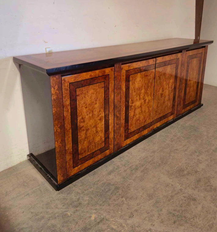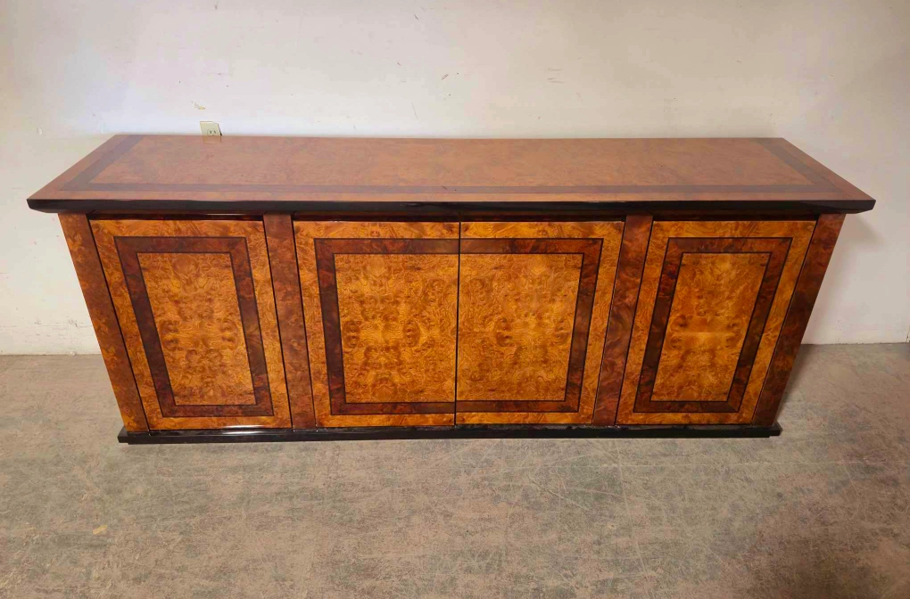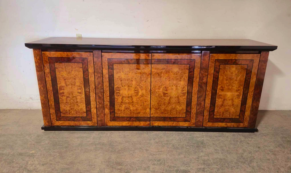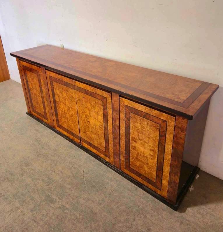 Italian Burlwood Sideboard With Storage. Delivery Available. Beautiful burlwood credenza with striking natural grain and contrasting inlay borders. A true statement piece with timeless style. 83.5w x 19.75d x 33.75h all in inches Features: Burl wood veneer with rich, warm tones. Geometric inlay detailing on doors and top. Four cabinet doors with generous storage inside. Sleek low profile, perfect as a sideboard, media console, or credenza. Pick up in downtown Vancouver or delivery may be arranged for a reasonable fee. Priority is given to those who are able to pick up. Tags: Antique drop leaf dining table, vintage dining furniture, solid wood dining table, farmhouse table, traditional dining room furniture, extendable table, space-saving table, heirloom furniture, rustic dining table, classic wood furniture, collectible antique table, foldable dining table, vintage home décor, early 20th century table, handcrafted antique furniture. Westendtrends furniture vanvaluevintage film local canada set dec