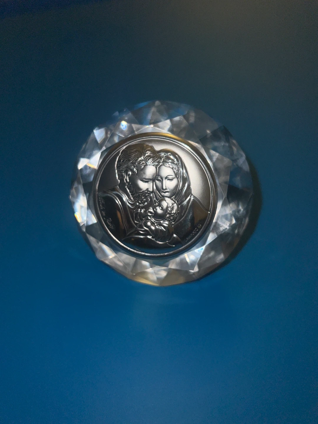 An Italian crystal and silver paperweight, depicting Holy Virgin Mary, baby Jesus, and Joseph. Sterling silver and crystal.