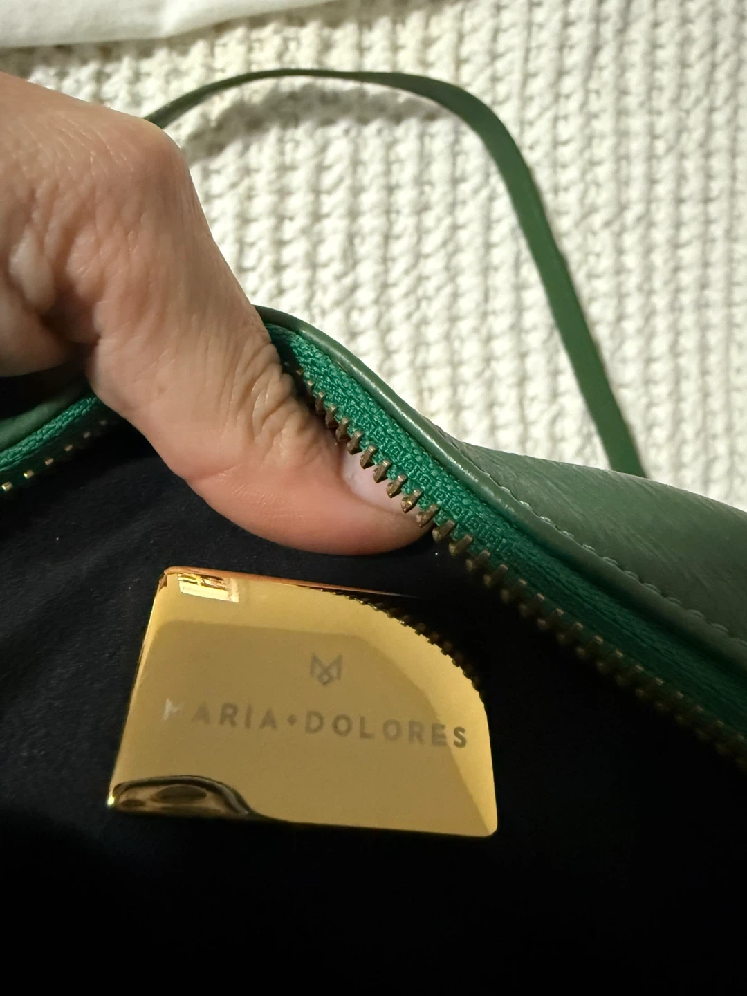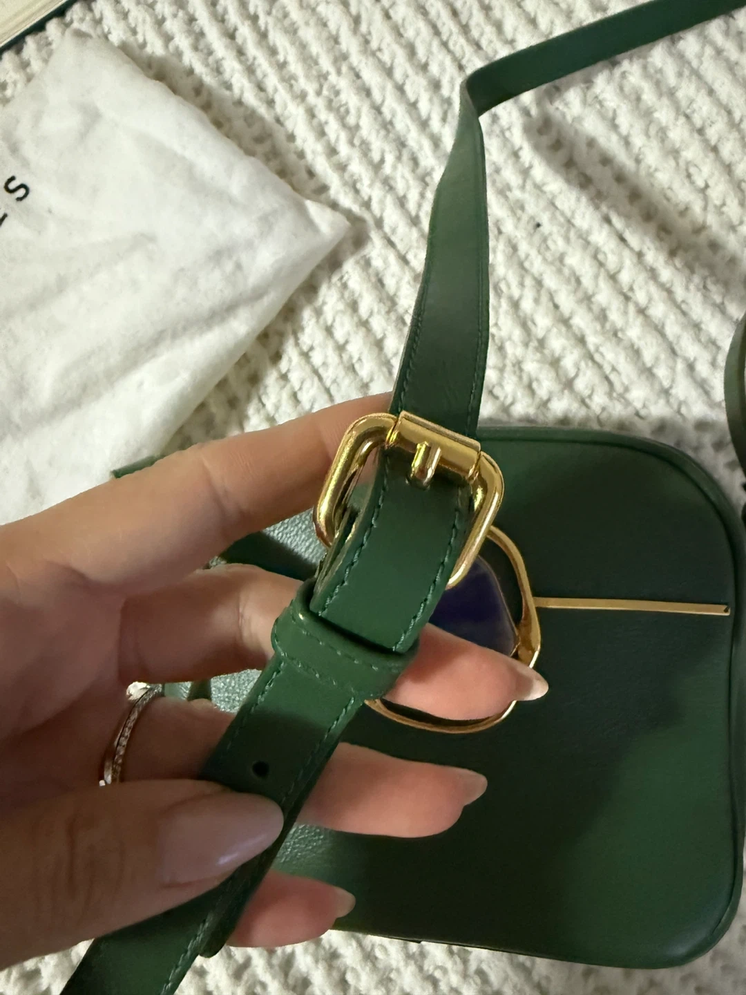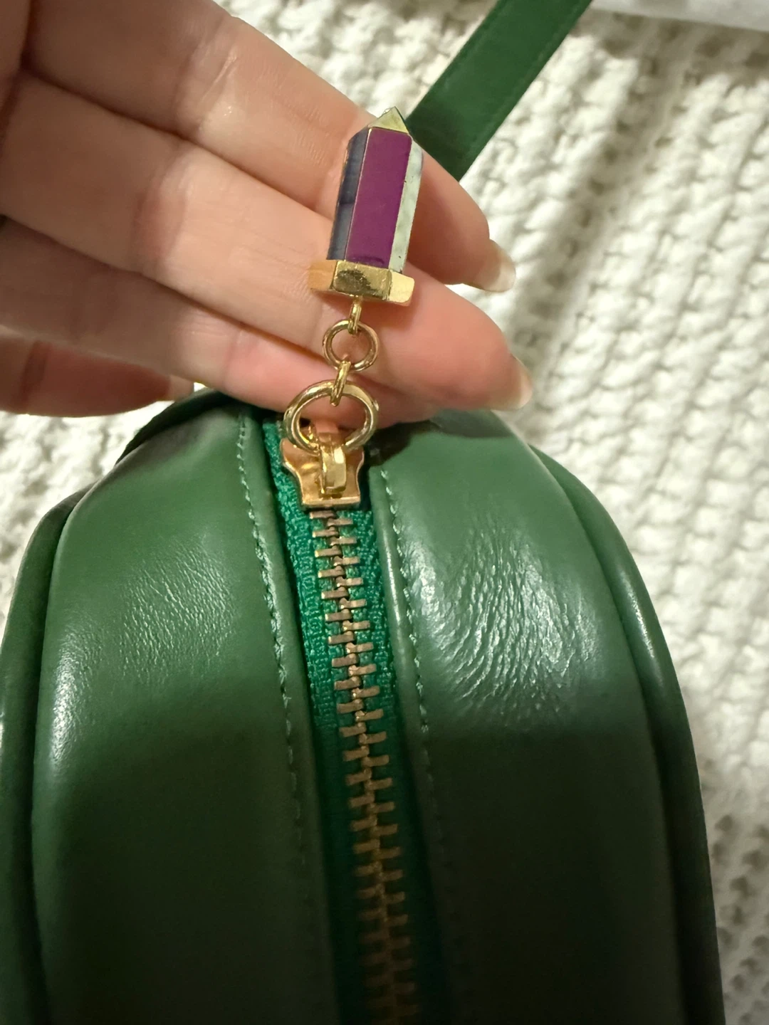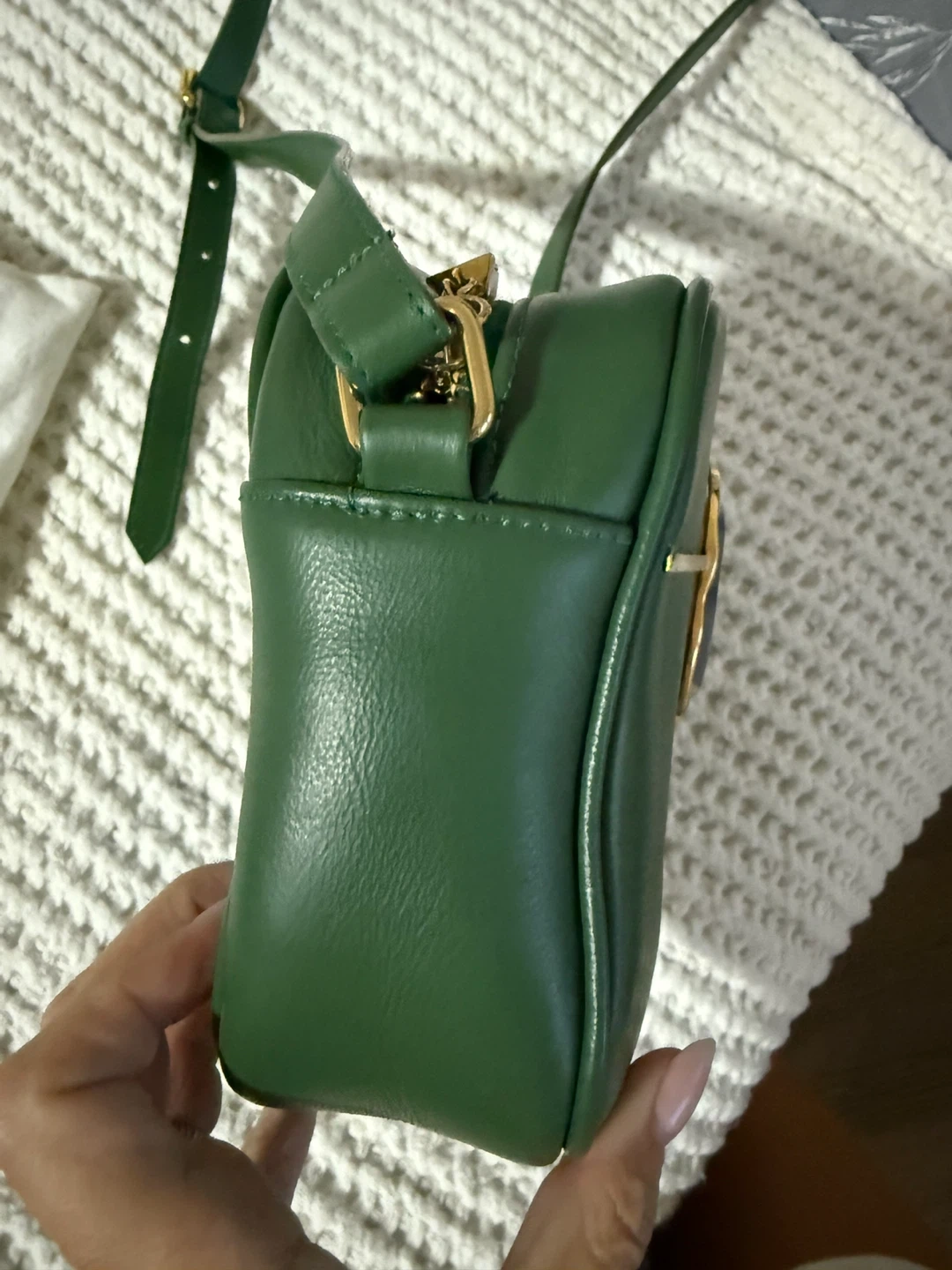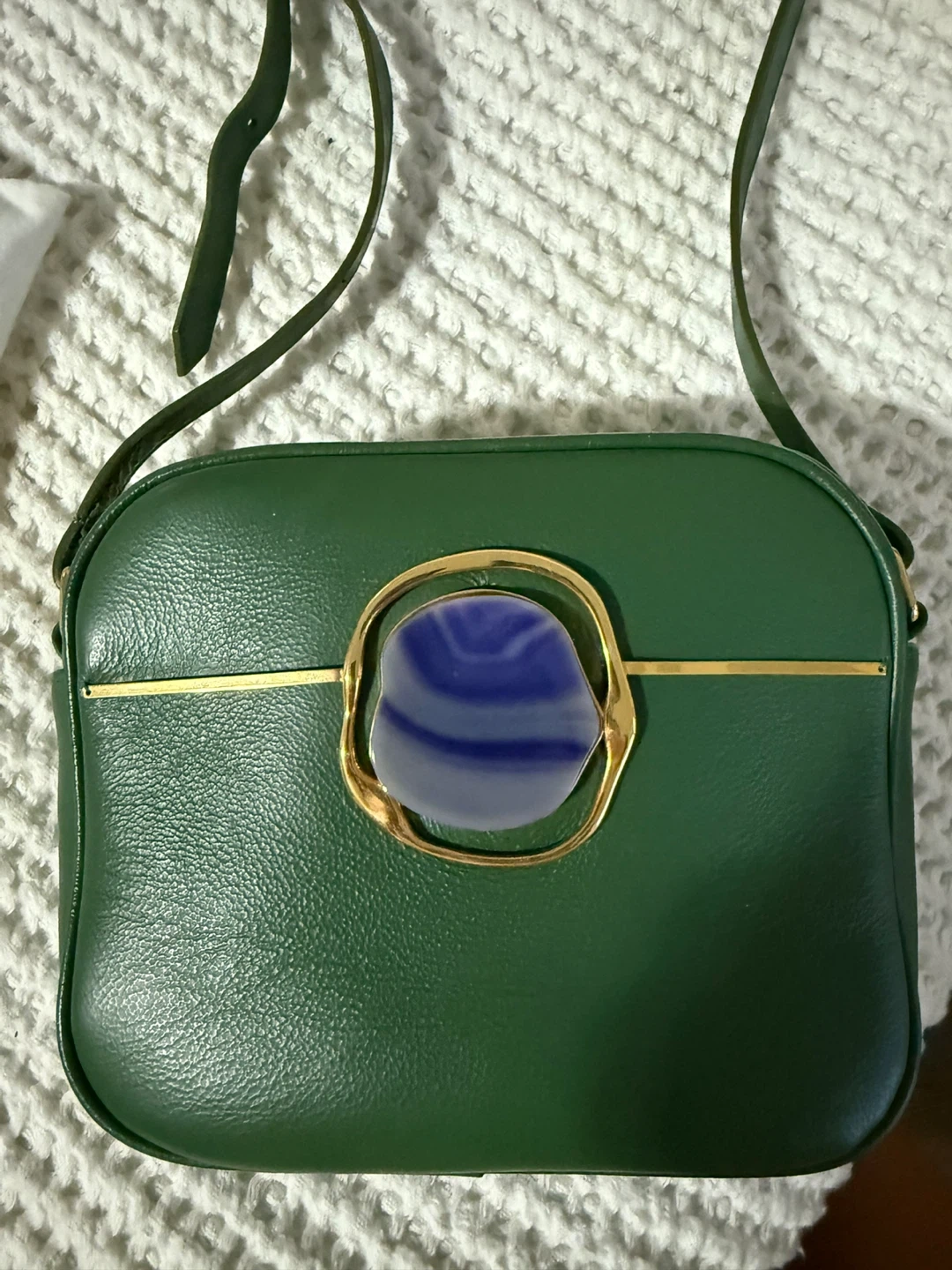 This is a beautiful green leather crossbody bag from Maria Dolores - boutique in Italy. It features a unique stone detail and gold hardware. It's in perfect condition, worn once. Purchase in Itally for $500.