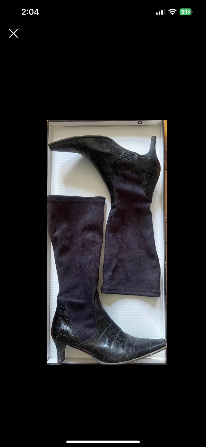Made in Italy, Bought here in Toronto mall in the 90s Genuine black leather (croc?) with very dark purple soft suede that has a fine floral detail Pointy toe look that elongates the leg Size 36, fits size 7 with thin sock, Narrow calf Soles look worn They’re sexy and I’ve become too shy for these!
