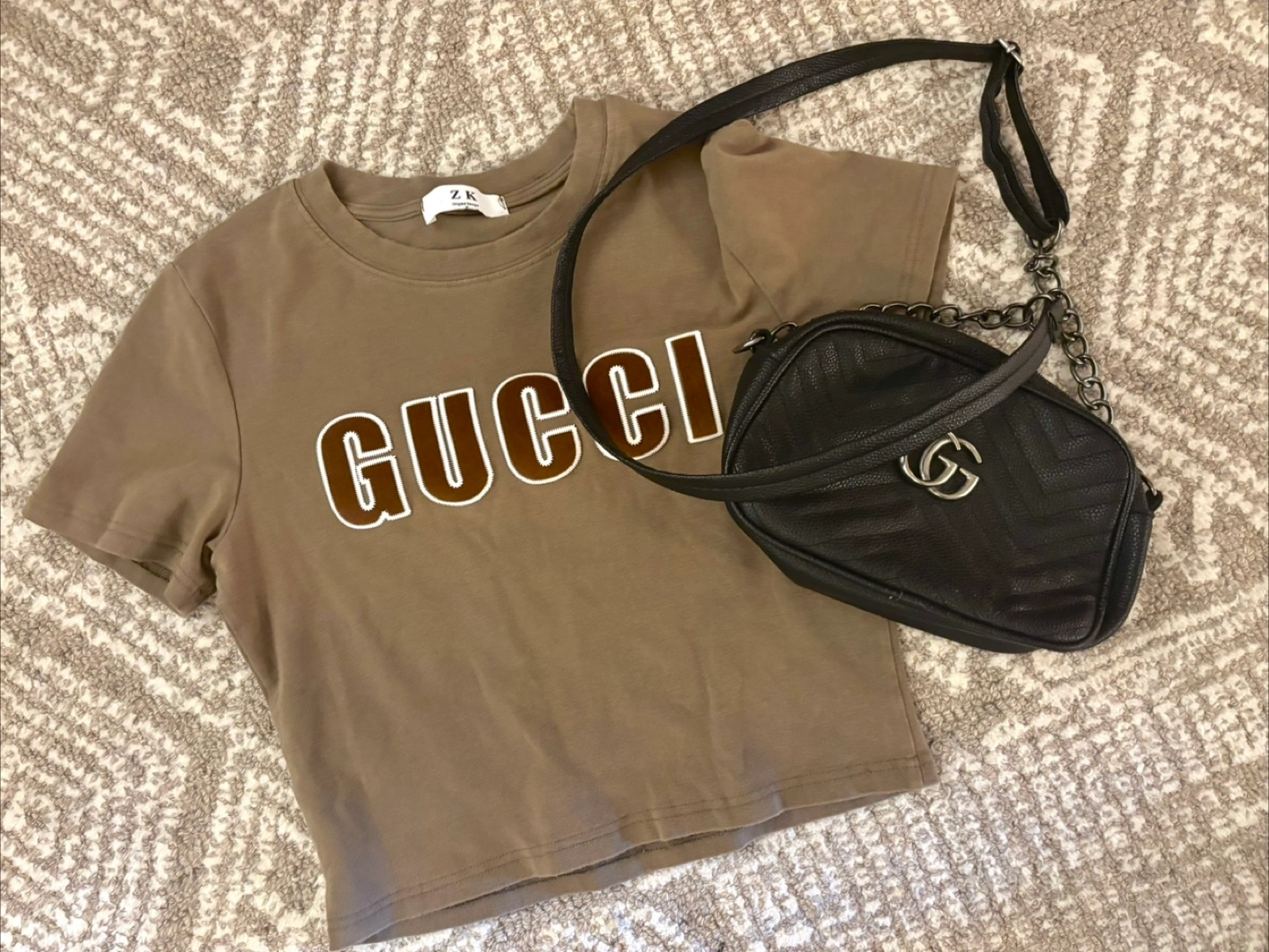 Guccxi Drip Quick sale bundle $40 Shirt is khaki colour - small slightly cropped, thick cotton with choco brown velour embroidered lettering