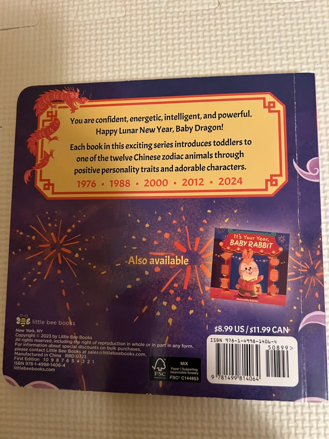 It's Your Year, Baby Dragon! This book introduces toddlers to one of the twelve Chinese zodiac animals through positive personality traits and adorable characters. It's part of an exciting series from Little Bee Books. Perfect for Lunar New Year celebrations!
