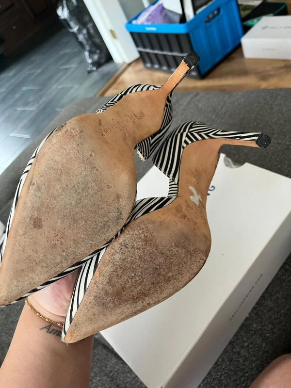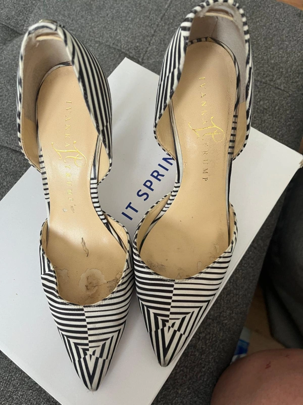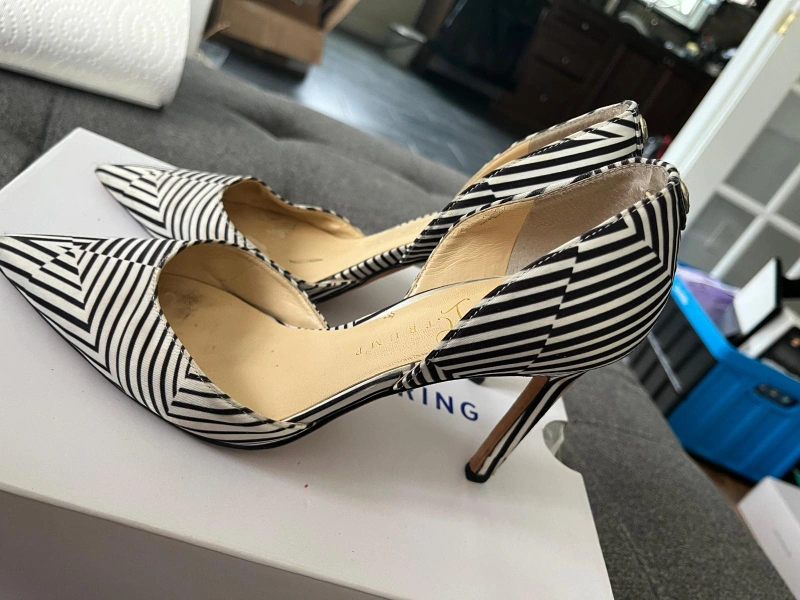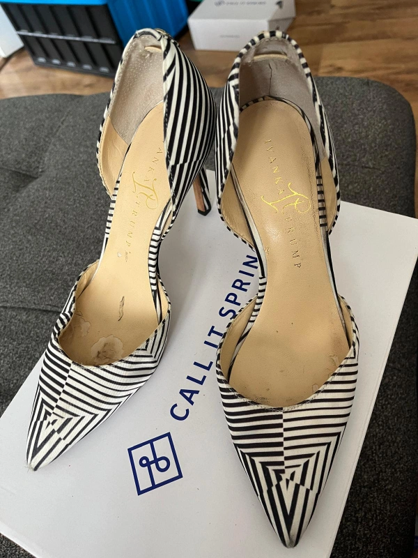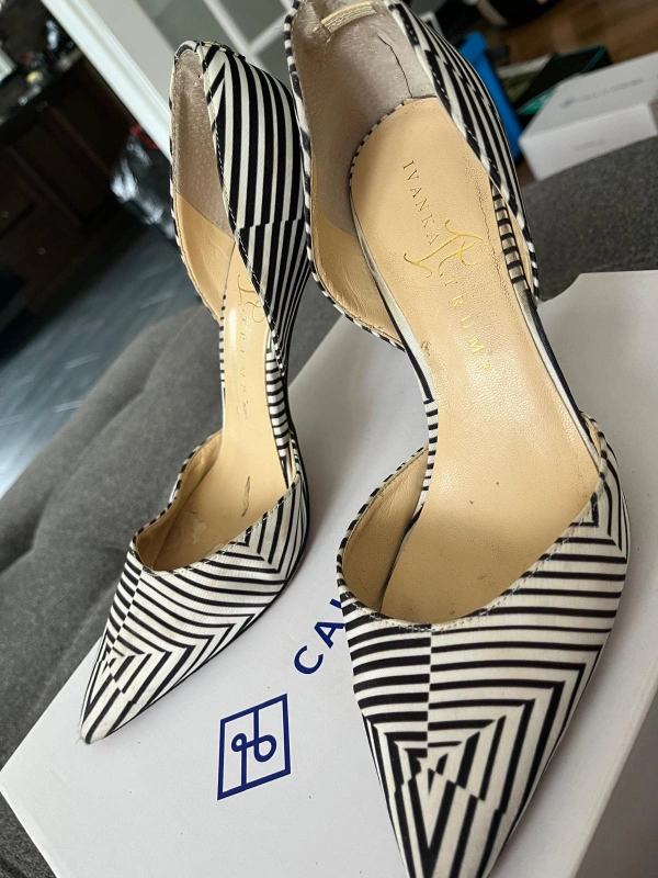 Ivanka Trump heels in a black and white striped pattern. They show some signs of wear on the soles and insoles, but still have lots of life left! Comes with the original box.