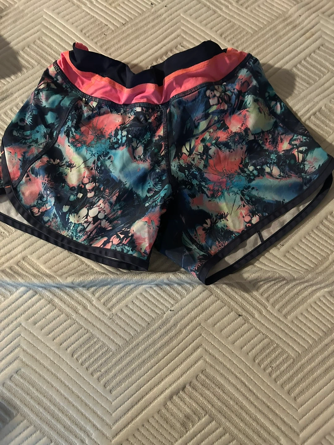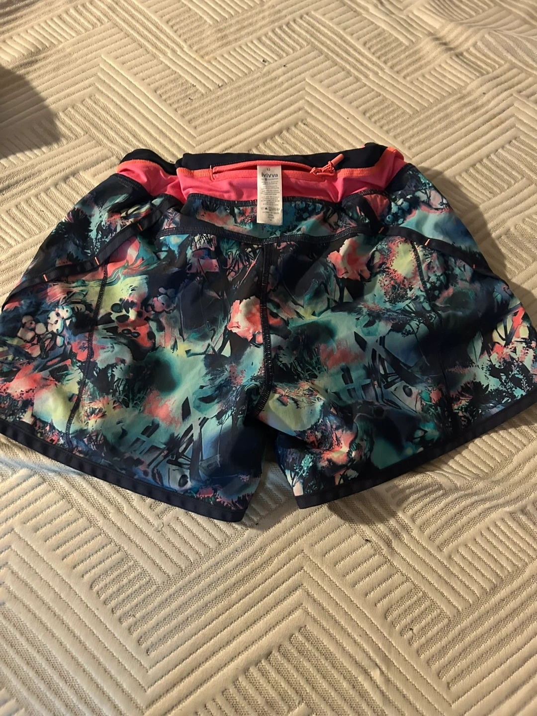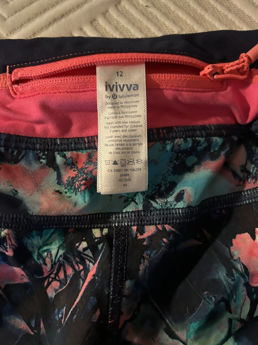 I'm selling a pair of Ivivva by Lululemon running shorts. They're a size 12 and have a fun floral pattern with pink accents. Perfect for running or other activities!