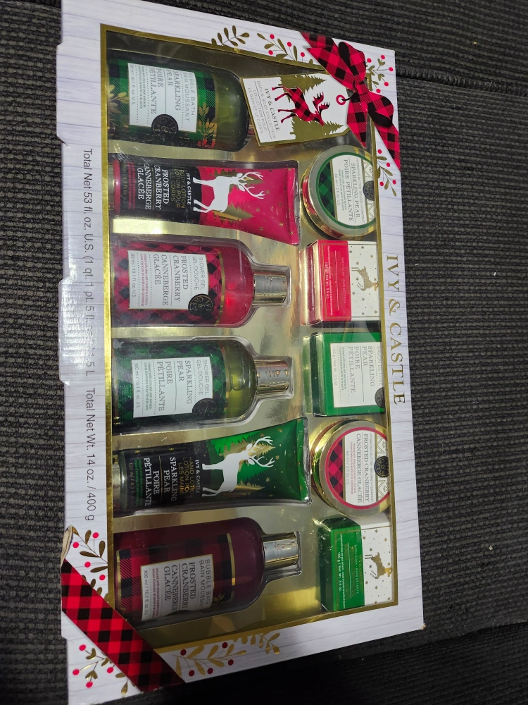 Selling a brand new Ivy & Castle gift set! This set includes a variety of bath and body products with sparkling pear and frosted cranberry scents. Perfect for a little self-care or as a gift for someone special! The box contains bubble bath, shower gel, body lotion, and more