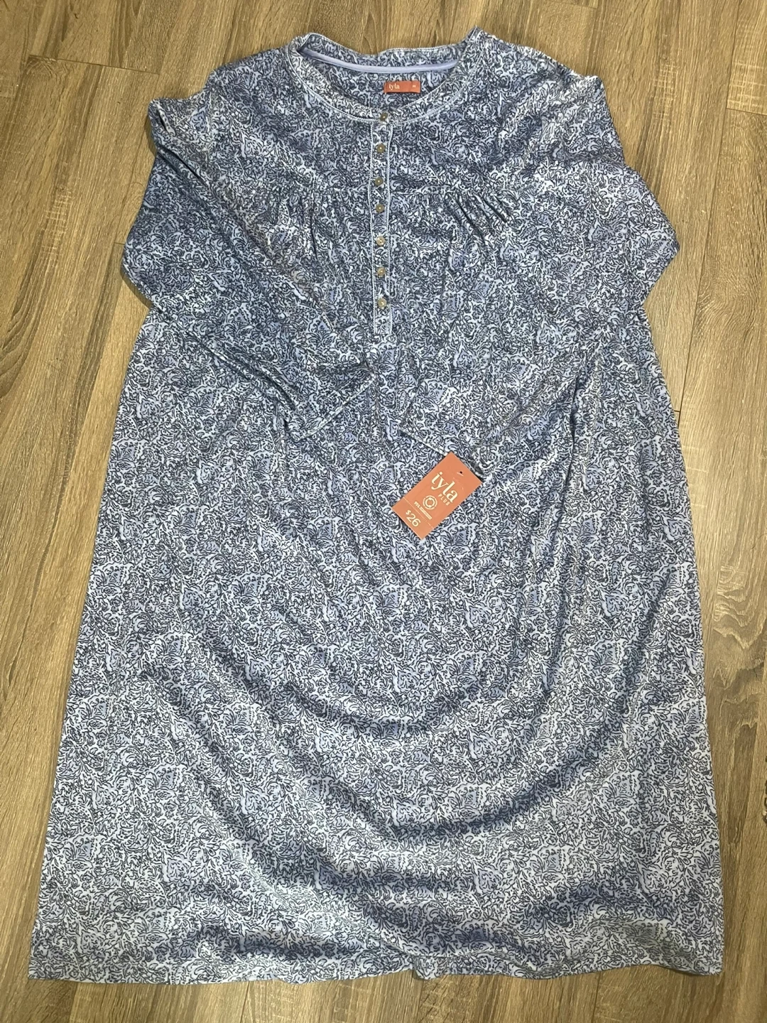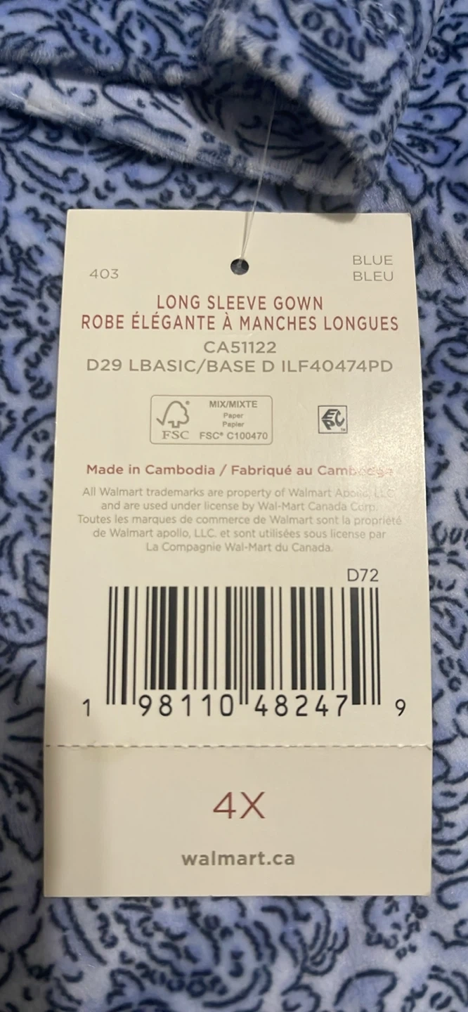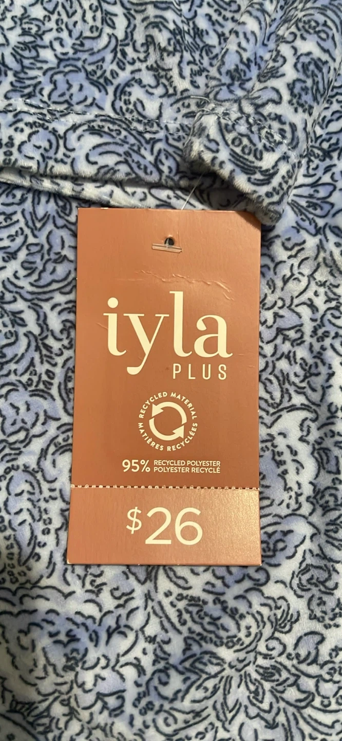 This is a brand new with tags Iyla Plus long sleeve gown in size 4XL. It's a pretty blue colour with a lovely pattern. The tag says it's made of 95% recycled polyester. Originally priced at $26!
