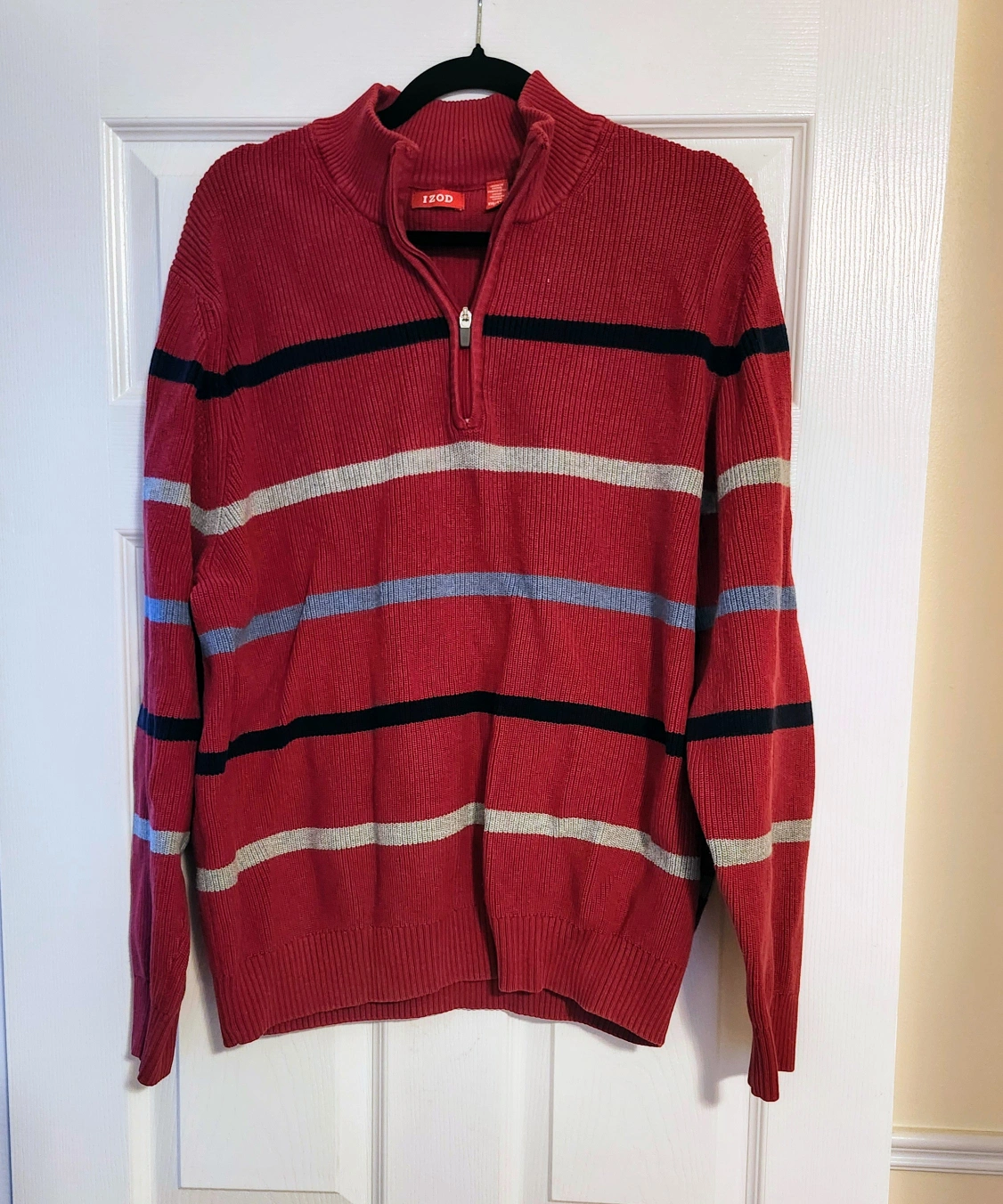 Men's red sweater. Features multiple coloured stripes. Half zip closure. Long sleeves. Ribbed knit.