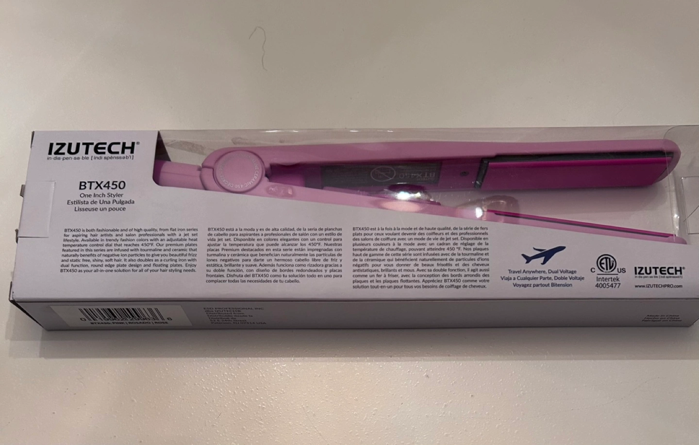Brand new, in box. One-inch styler. Adjustable temperature up to 450°F. Premium tourmaline ceramic plates. Features floating plates, negative ions, and a one-year exchange warranty.