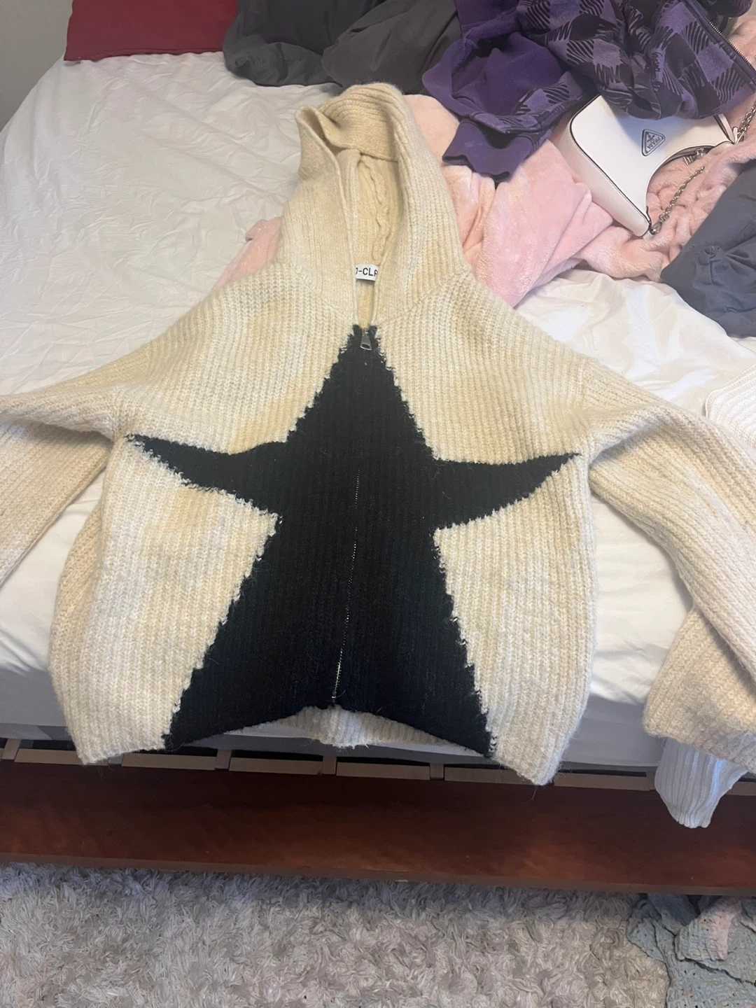 Cozy J-CLA knit zip-up hoodie in a cream colour with a black star design! It's super comfy and perfect for layering on chilly days