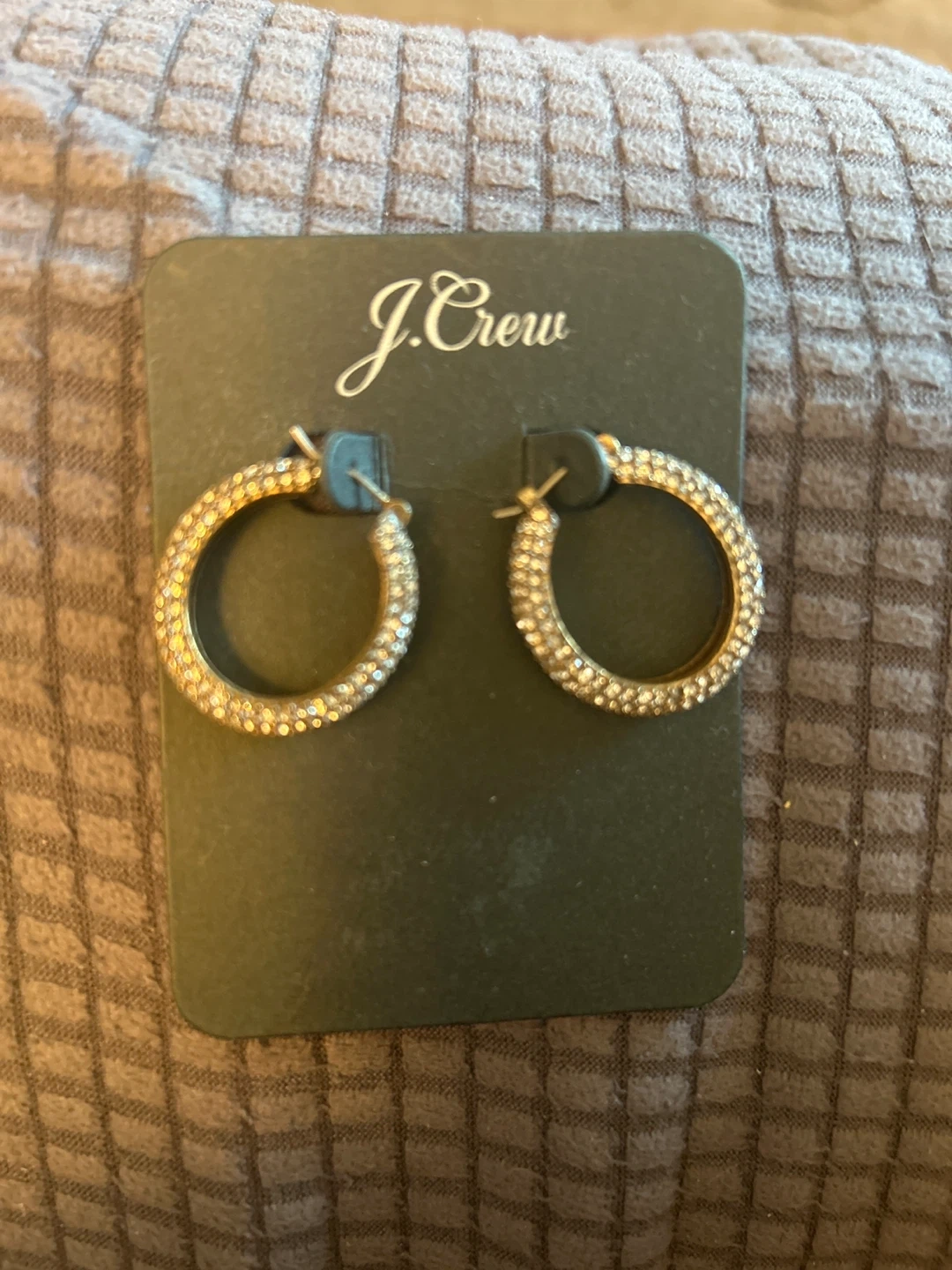 These are a pair of J.Crew hoop earrings. They feature a gold tone and are covered in crystals. They are in excellent condition!