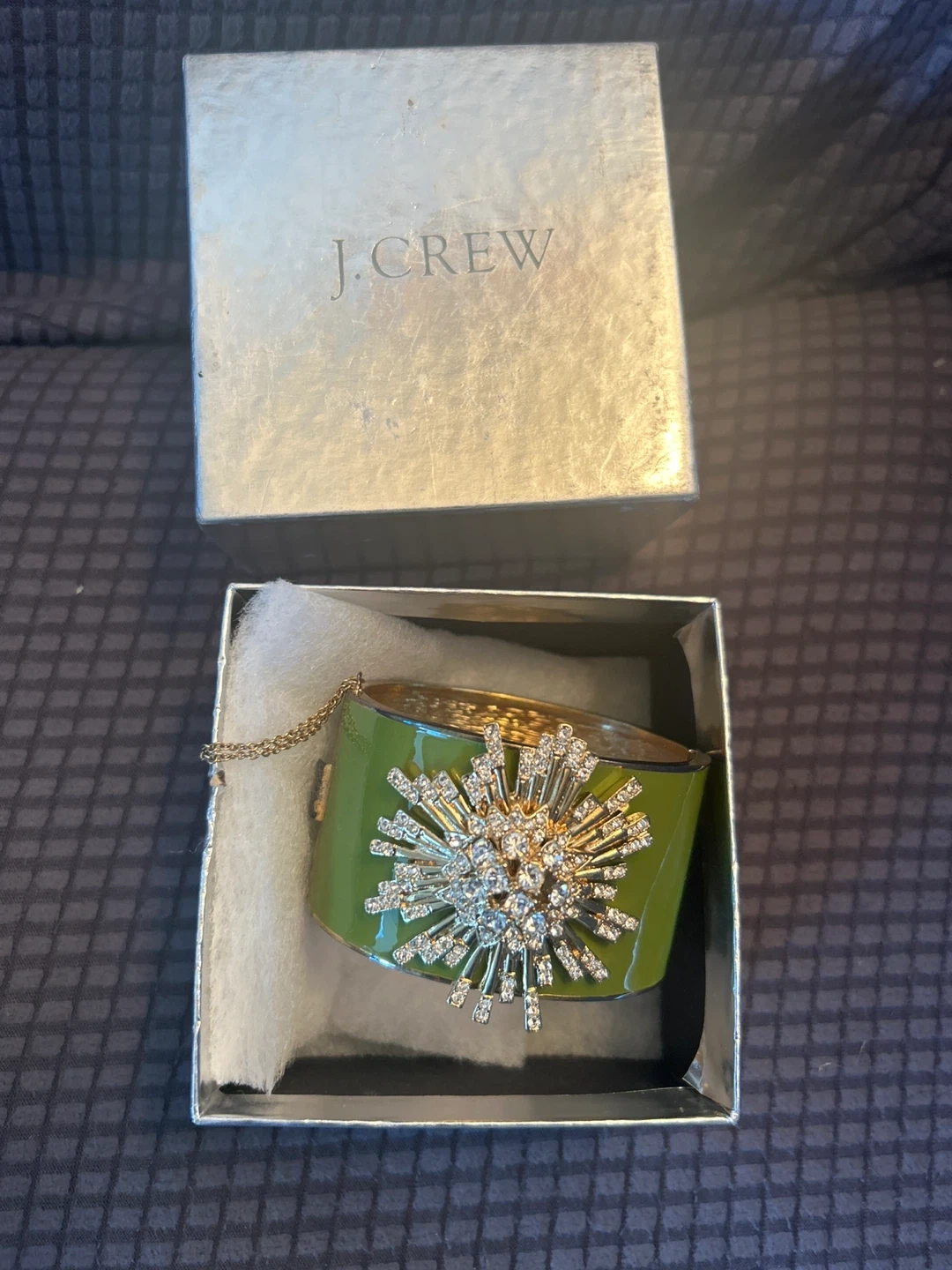 Selling a J. Crew cuff bracelet. It's a vibrant green colour and comes with its original box! The bracelet features a beautiful starburst design with sparkling stones. Perfect for adding a pop of colour to any outfit