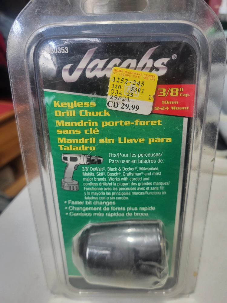 Selling a new Jacobs Keyless Drill Chuck with a 3/8" capacity. It's designed for faster bit changes and fits most major brands like DeWalt, Black & Decker, Milwaukee, Makita, Skil, Bosch, and Craftsman. Works with both corded and cordless drills. Originally priced at CD $29.99!