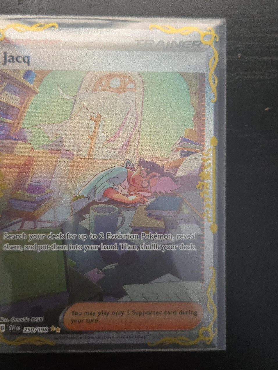 Selling a Jacq Pokémon Trainer card. It's a Supporter card, illustrated by Oswaldo Kato. The card allows you to search your deck for up to 2 Evolution Pokémon, reveal them, and put them into your hand, then shuffle your deck. You may play only 1 Supporter card during your turn