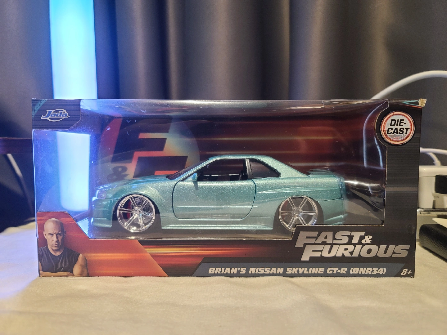 Selling a Jada Toys Fast & Furious Brian's Nissan Skyline GT-R (BNR34) die-cast car! This model is suitable for ages 8 and up. A great collectible for any Fast & Furious fan!