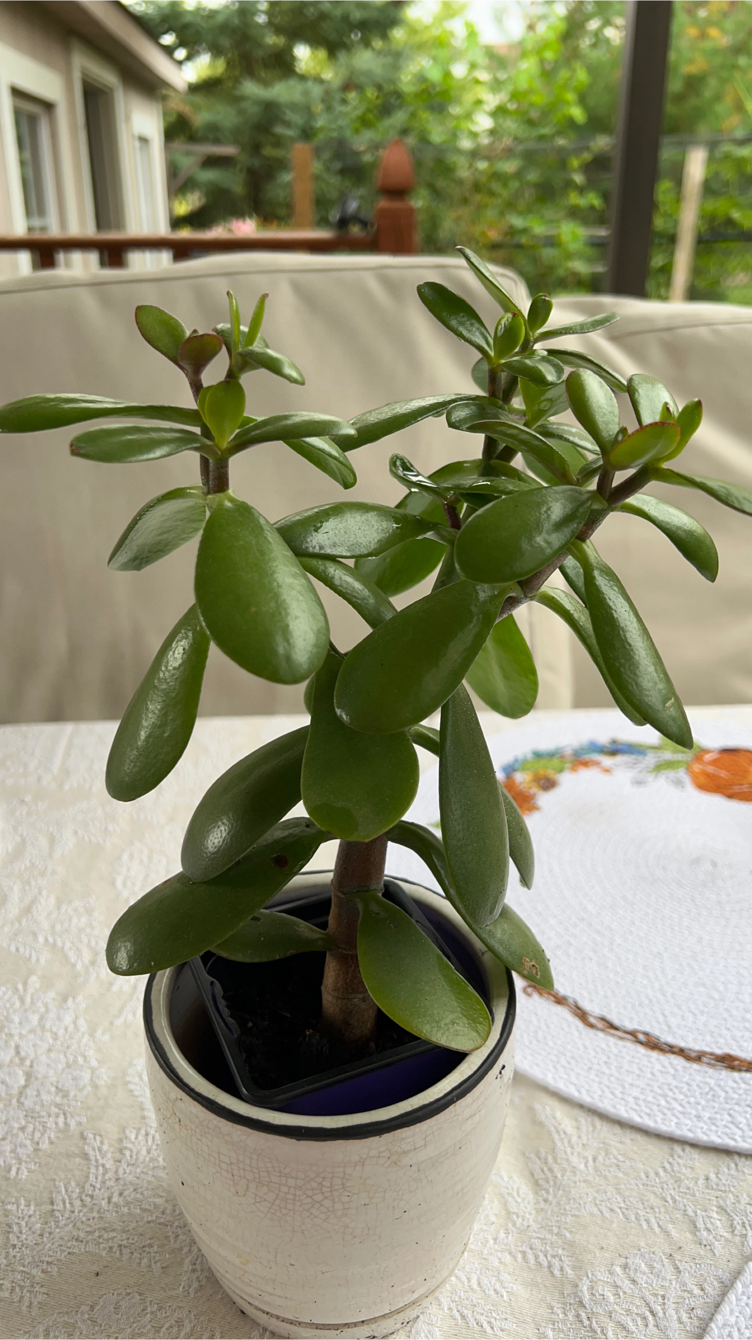 A healthy jade plant in a white pot looking for a new home! It's a lovely little plant that's easy to care for and adds a touch of green to any space