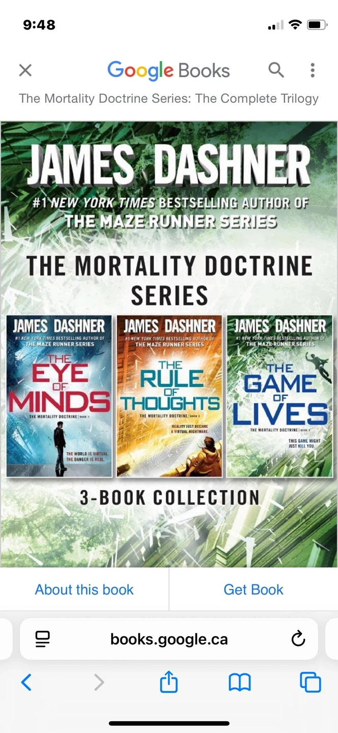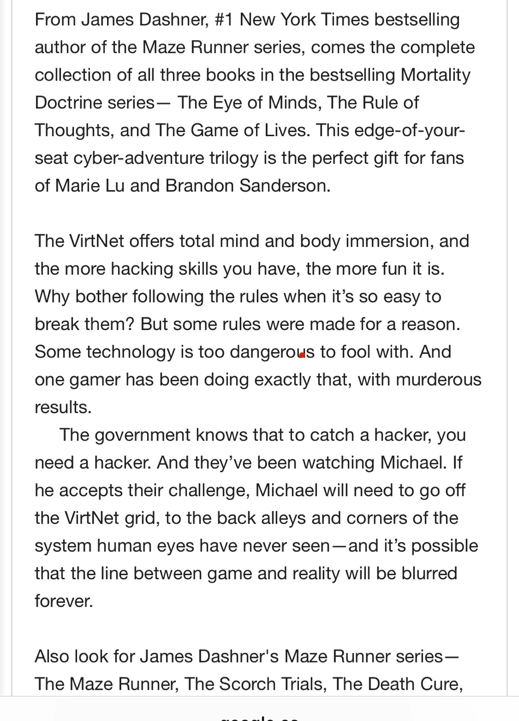James Dashner - 3 BOOK SET (author of The Maze Runner Series) - **The Mortality Doctrine Series: ** The Complete Trilogy: The Eye of Minds; The Rule of Thoughts; The Game of Lives Set of 3 books. Great for classrooms, school programs, daycare, homeschool, collectors. Excellent gifts. First come first served - we don’t hold items. Walking distance from Mapleview mall
