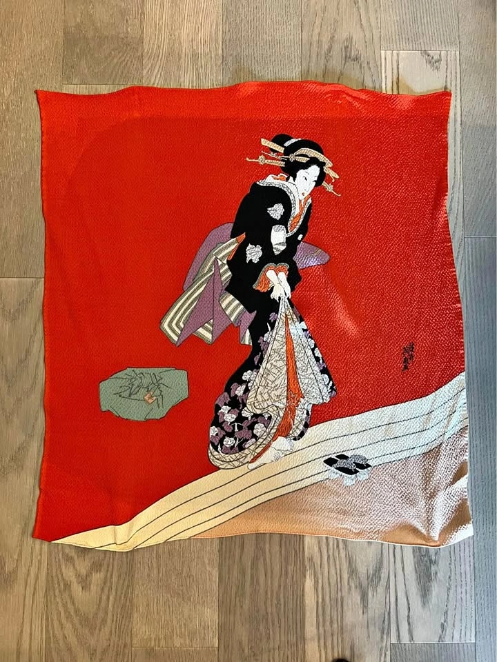 Vintage Geisha Girl Japanese scarf. Large square shape, measures 27" x 27". Shows a Geisha Girl removing her sandals at the entryway. Fabric has a textured feel. Good condition. Made of possibly either silk or rayon, tag says 100% but rest is Japanese Kanji. Lovely scarf that would look beautiful framed and hung as art or worn as an accessory. Originally from Japan.