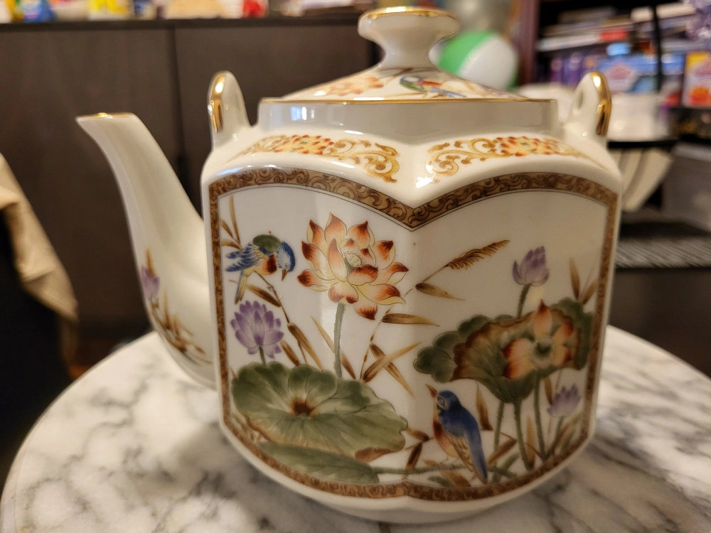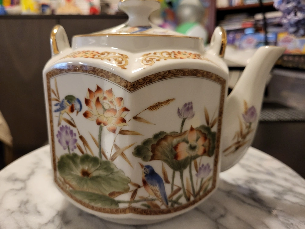 Beautiful teapot. Features a unique octagonal shape. Intricate floral and bird design. Gold accents. Made in Japan.