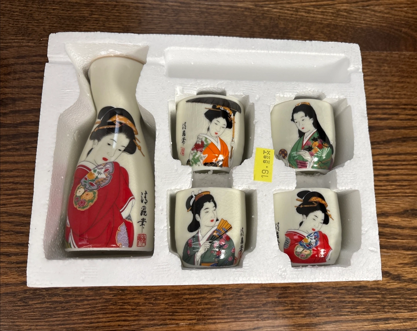 Selling a lovely Japanese sake set featuring a beautiful geisha design. The set includes a sake bottle and four cups, all in excellent condition. It comes in its original packaging, ensuring safe transport! Originally priced at $19.99.