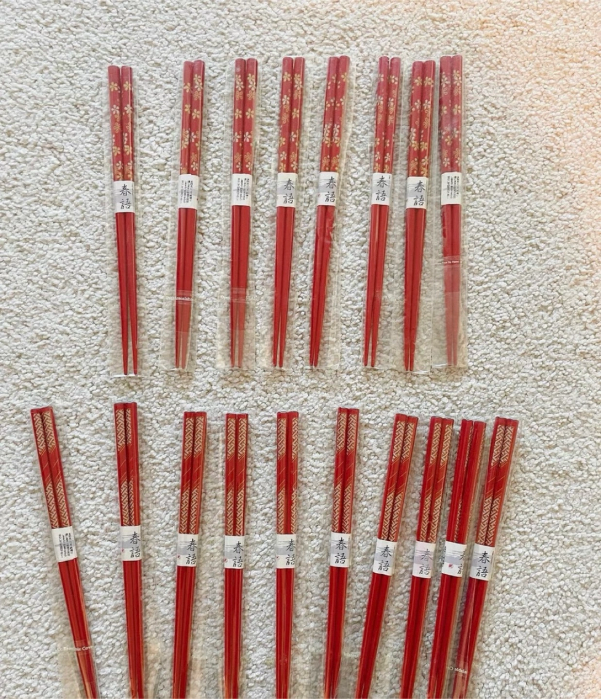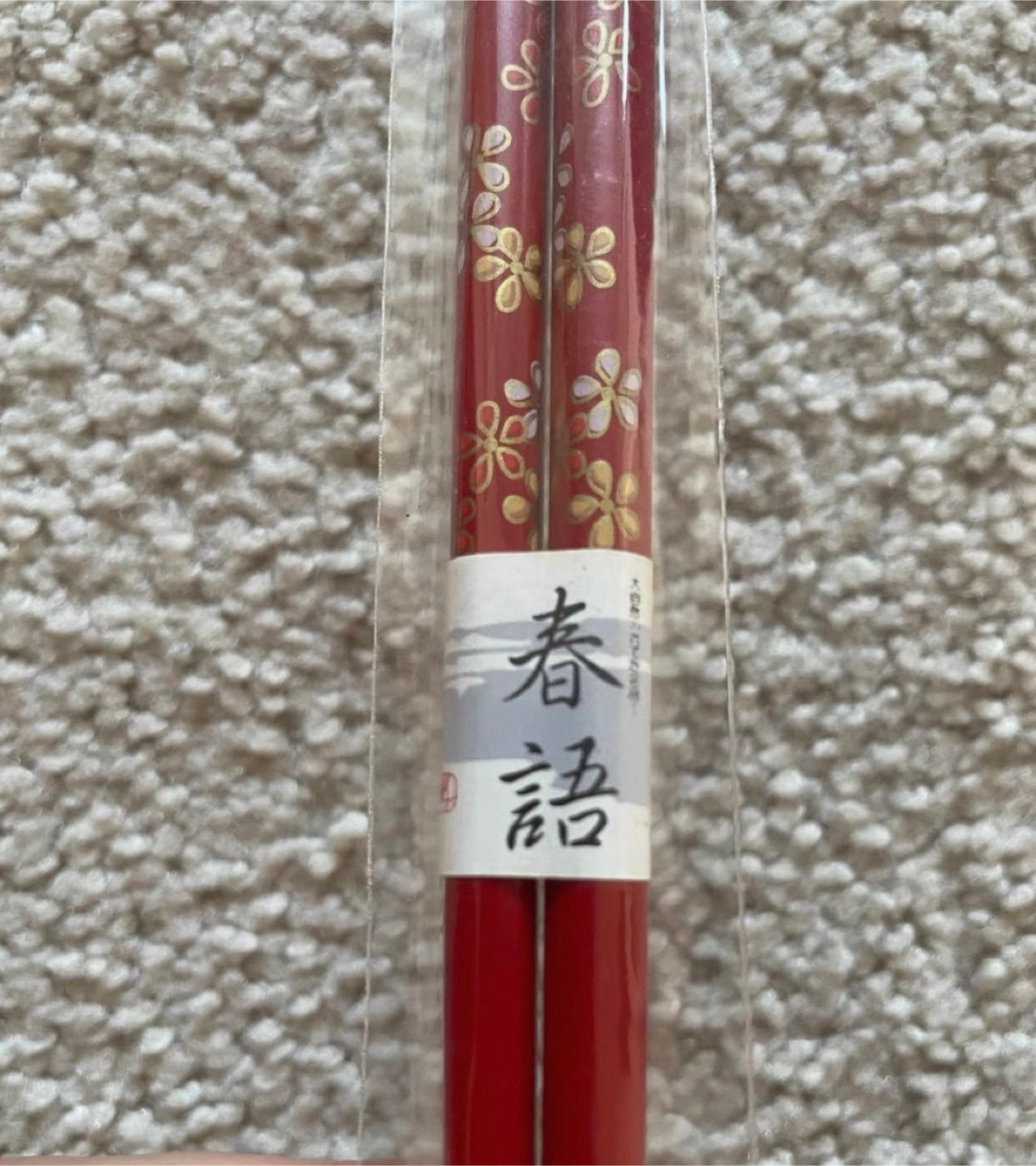 These are some lovely chopsticks with a Japanese-style floral design. They are red and come in their original packaging. Perfect for adding a touch of elegance to your dining experience!