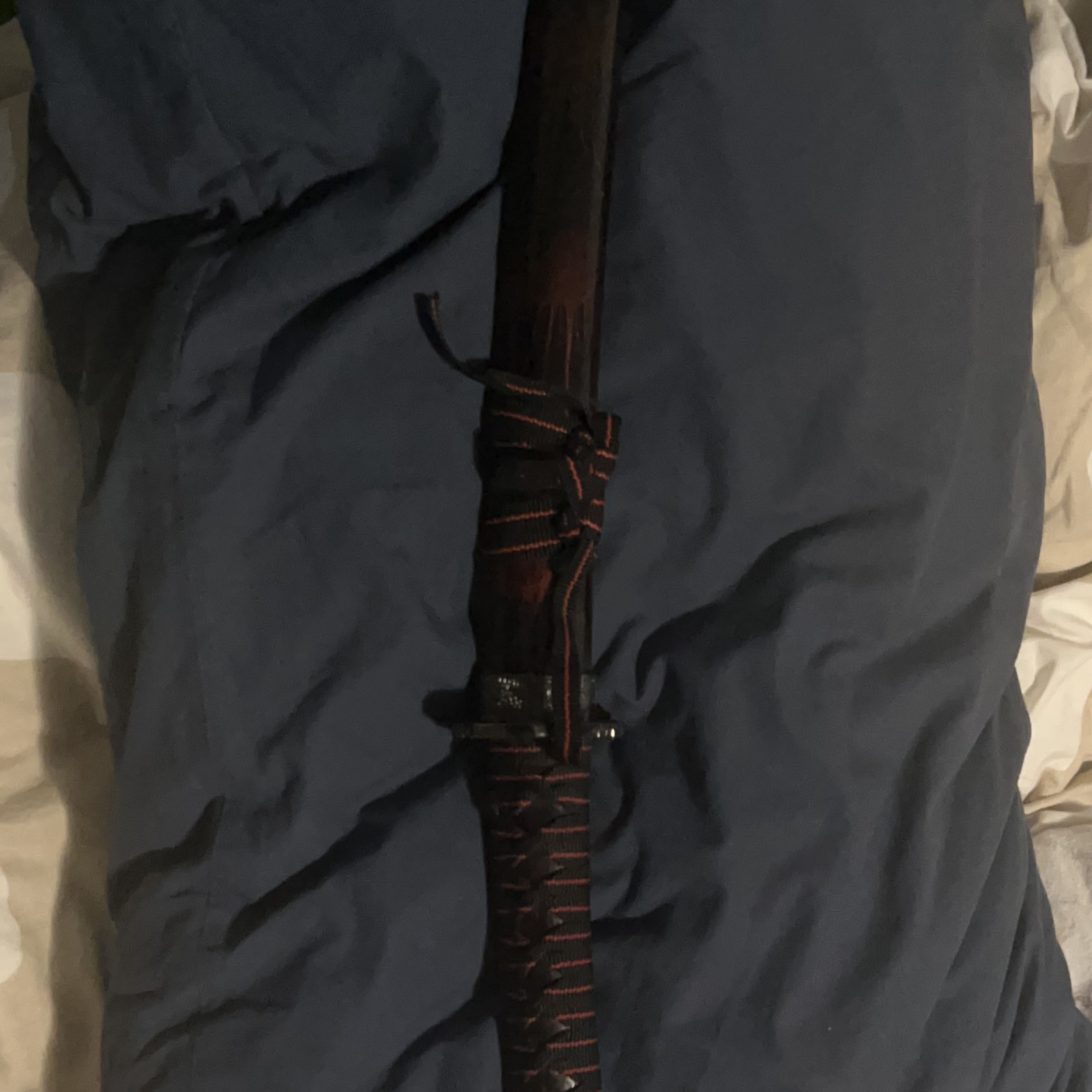 Collectible Japanese-style wakizashi. Black scabbard with red accents. Blade shows some minor wear. Great for display or cosplay.