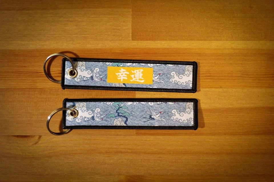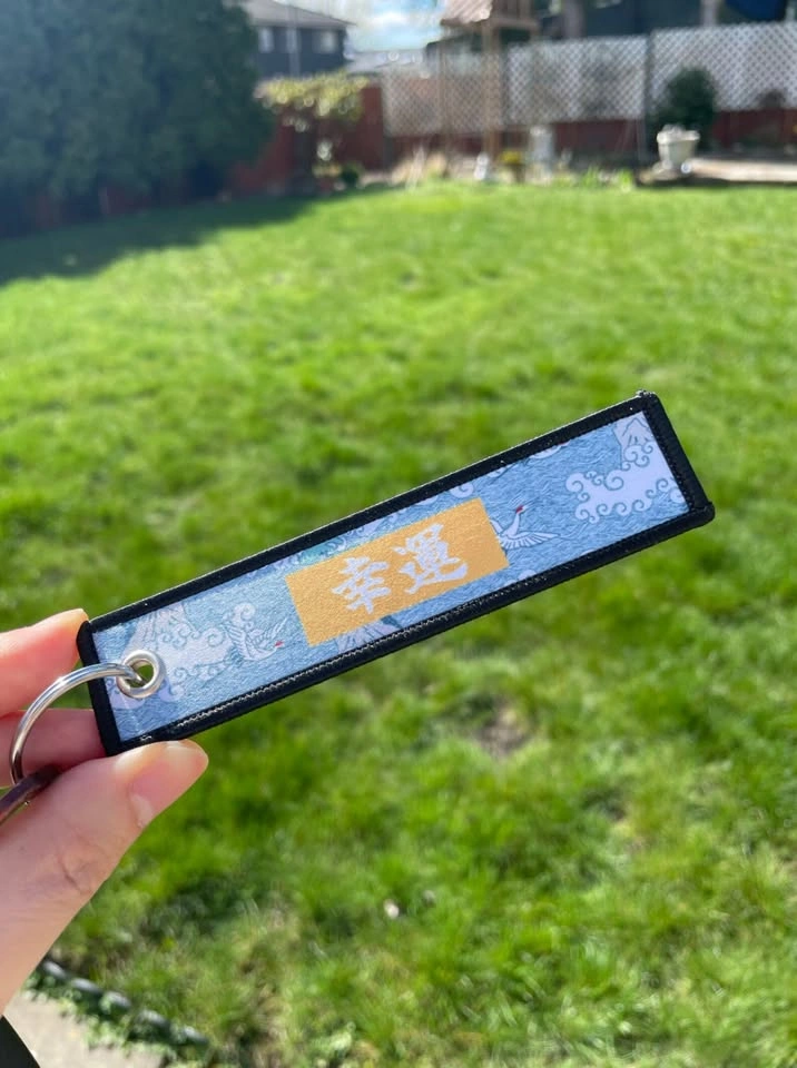 Inspiration: The hand-made key tag illustration is an original artwork inspired by a traditional japanese art style called ukiyo-e(浮世絵). Meaning: 幸運 in japanese means fortune and good luck, The white heron represents peace and longevity. Designer's note: The key chain was designed with the designer's intention of bringing peace and safety to its owner to return home from their daily journey. you can use it as your home keychain, car key chain, motorcycle key chain, or on your backpack. Material: made with woven twill fabric with black fine embroidered thread. The photo you see shows both sides of the tag. Size: 13cm x 3cm - 3cm keyring included