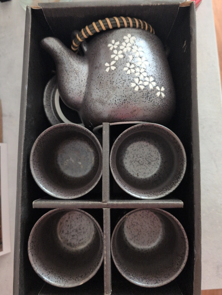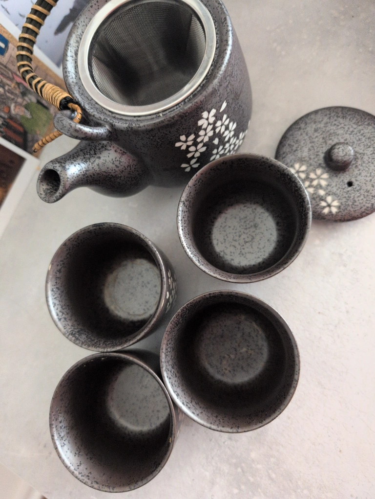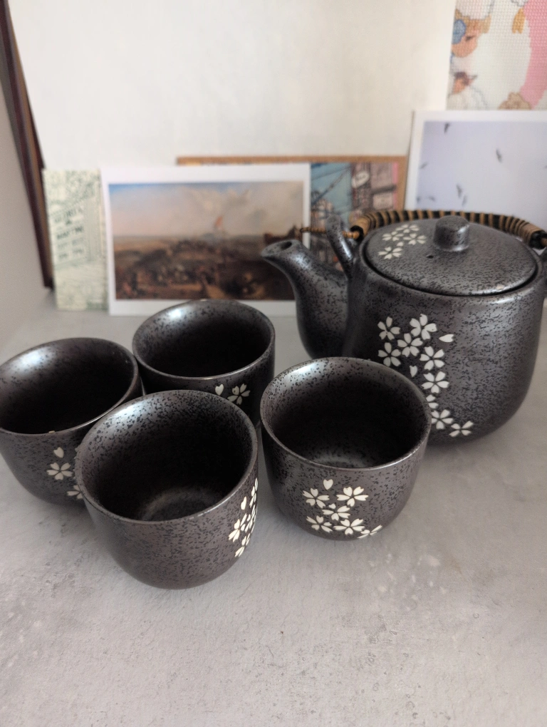 Here's a lovely Japanese tea set, perfect for enjoying a relaxing cup! It includes a teapot with a built-in strainer and four matching cups. The set features a beautiful dark grey speckled finish with delicate white floral designs. It comes in its original box, making it great for gifting or storing.