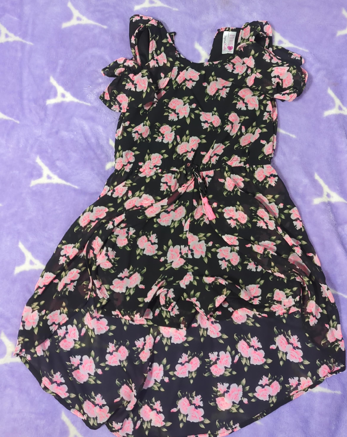Selling a cute Japna Kids dress, size 10! The dress is black with a pink floral pattern. Perfect for a special occasion or just a fun day out. It has a stylish high-low hem and cold shoulder cutouts