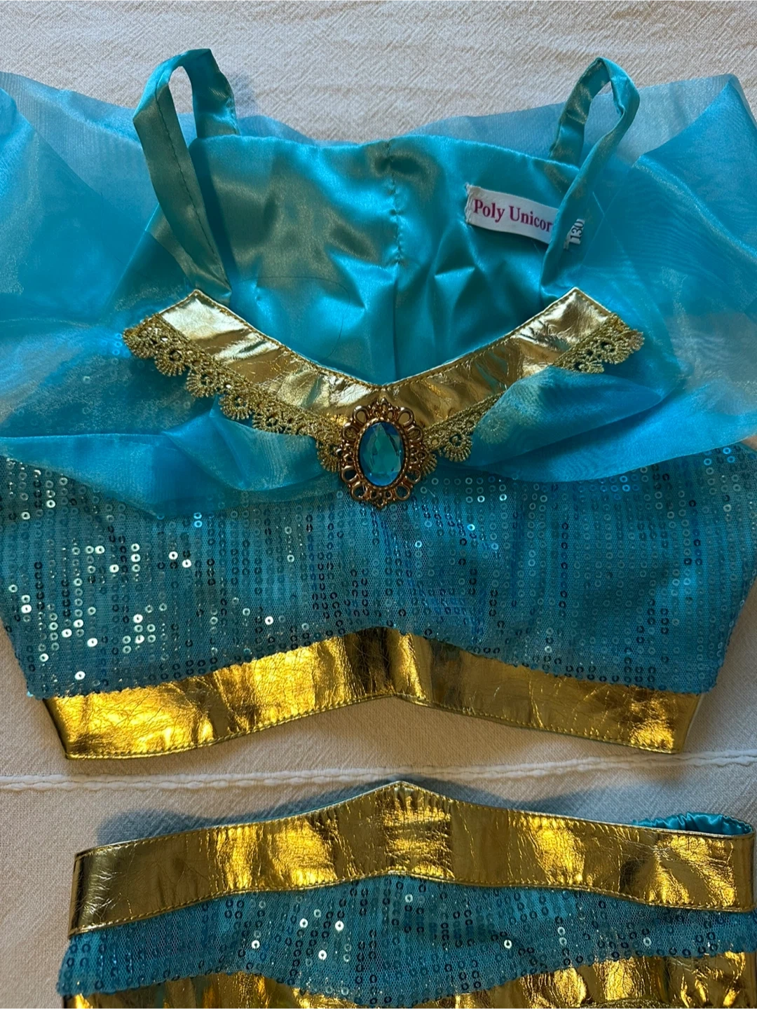 This is a beautiful Jasmine costume from Poly Unicorn! It's in great condition and perfect for dress-up or Halloween. The costume features a sparkly top and pants with gold detailing. A fun addition to any child's wardrobe! Ages 8-10