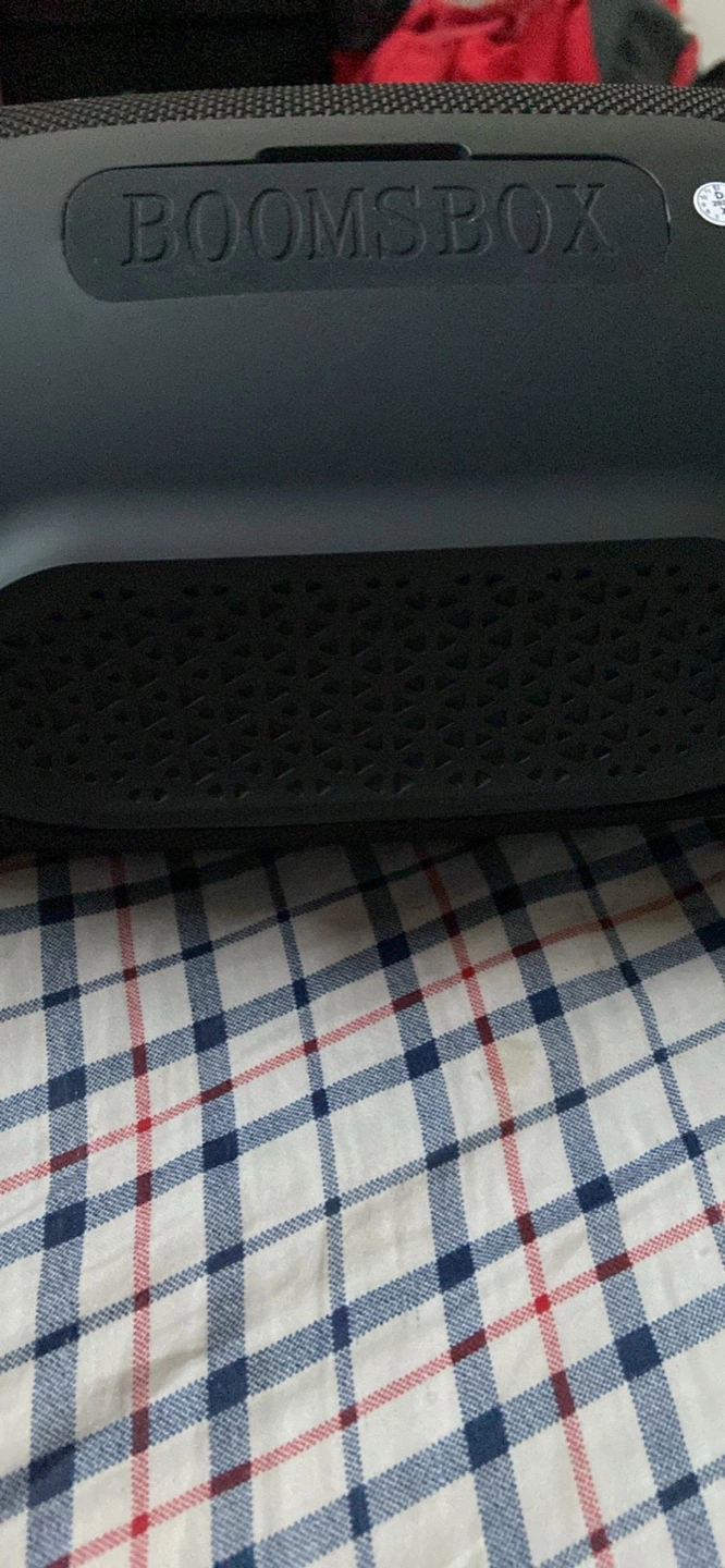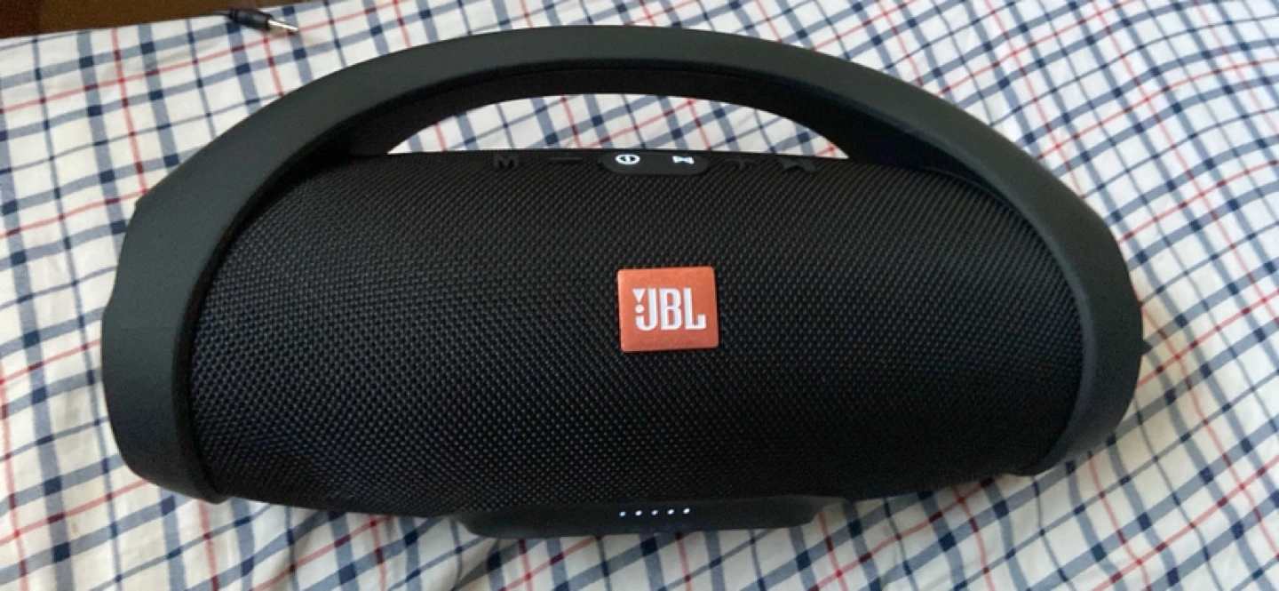 Portable Bluetooth speaker. Great sound quality. Durable design. Black colour. Includes a carrying handle.