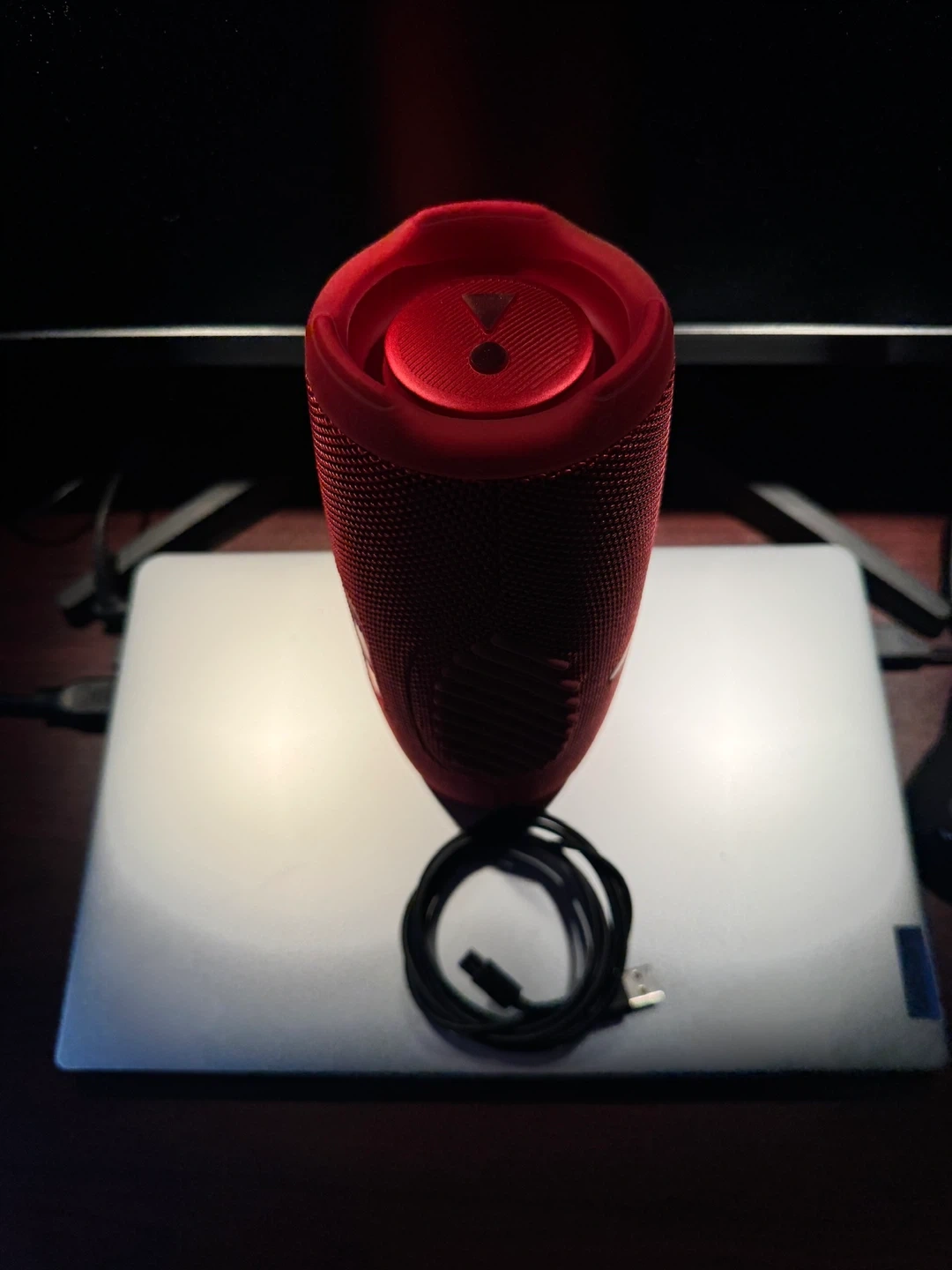 Selling a JBL Charge 5 in red. It's a portable Bluetooth speaker that's great for taking your music on the go. It comes with a charging cable, like new condition, used only once.