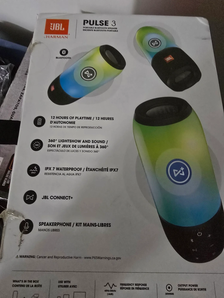 Selling a JBL Pulse 3 portable Bluetooth speaker in excellent condition! It comes with the original box. Enjoy 12 hours of playtime, a 360° lightshow and sound, and IPX7 waterproofing. It also features JBL Connect+ and a speakerphone function