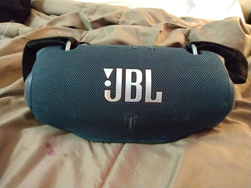 Features a handle on the top and a shoulder strap. The speaker is a dark blue colour. It's an amazing choice to bring music with you to the beach to wind down.