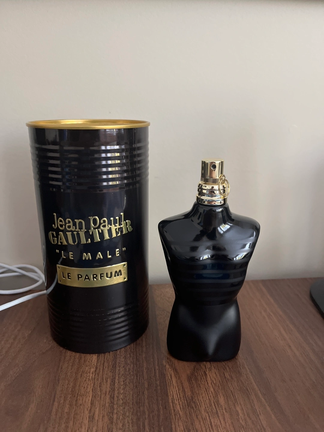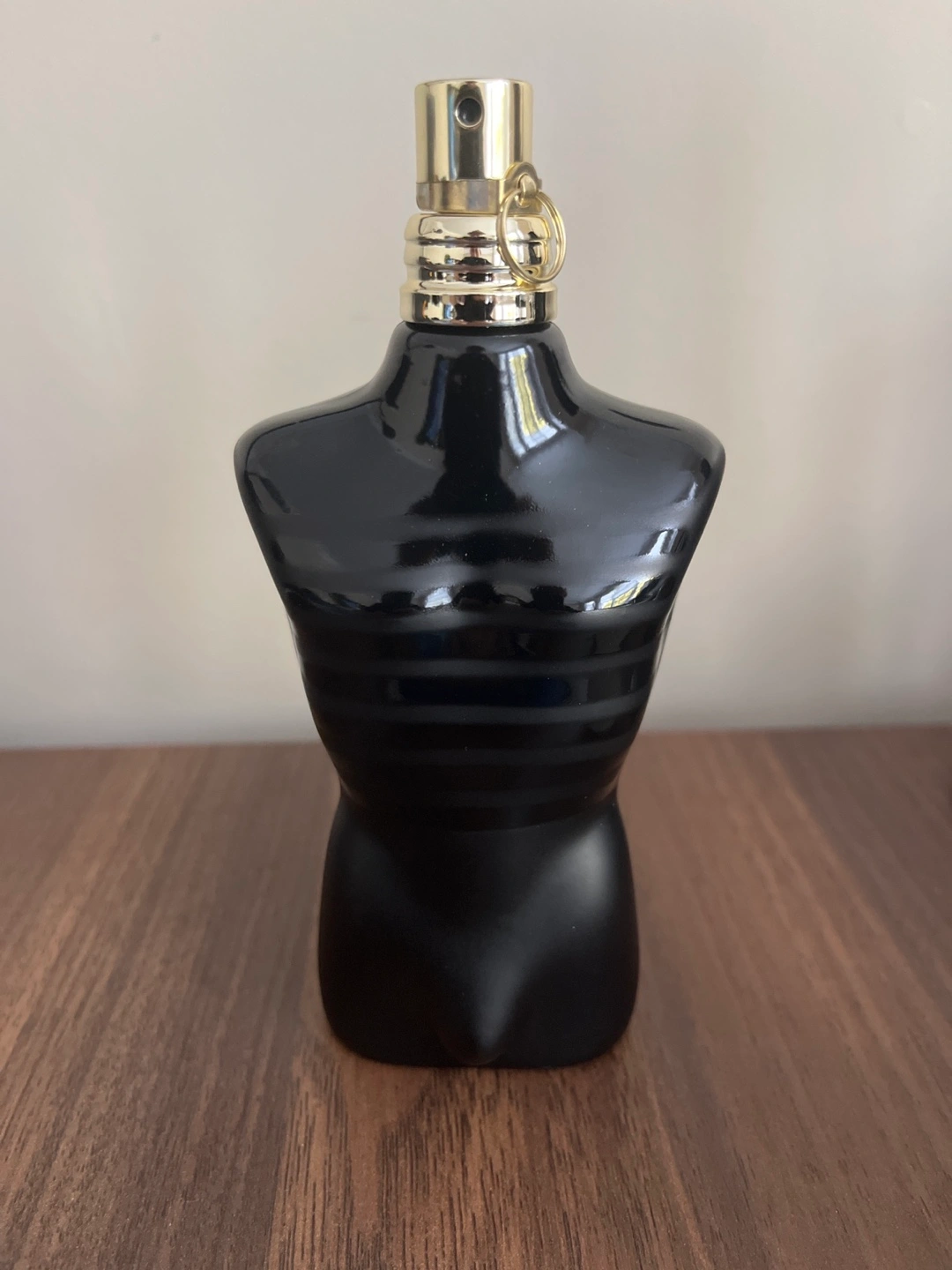 Men's fragrance. Black torso-shaped bottle. Gold accents. Comes in original packaging.