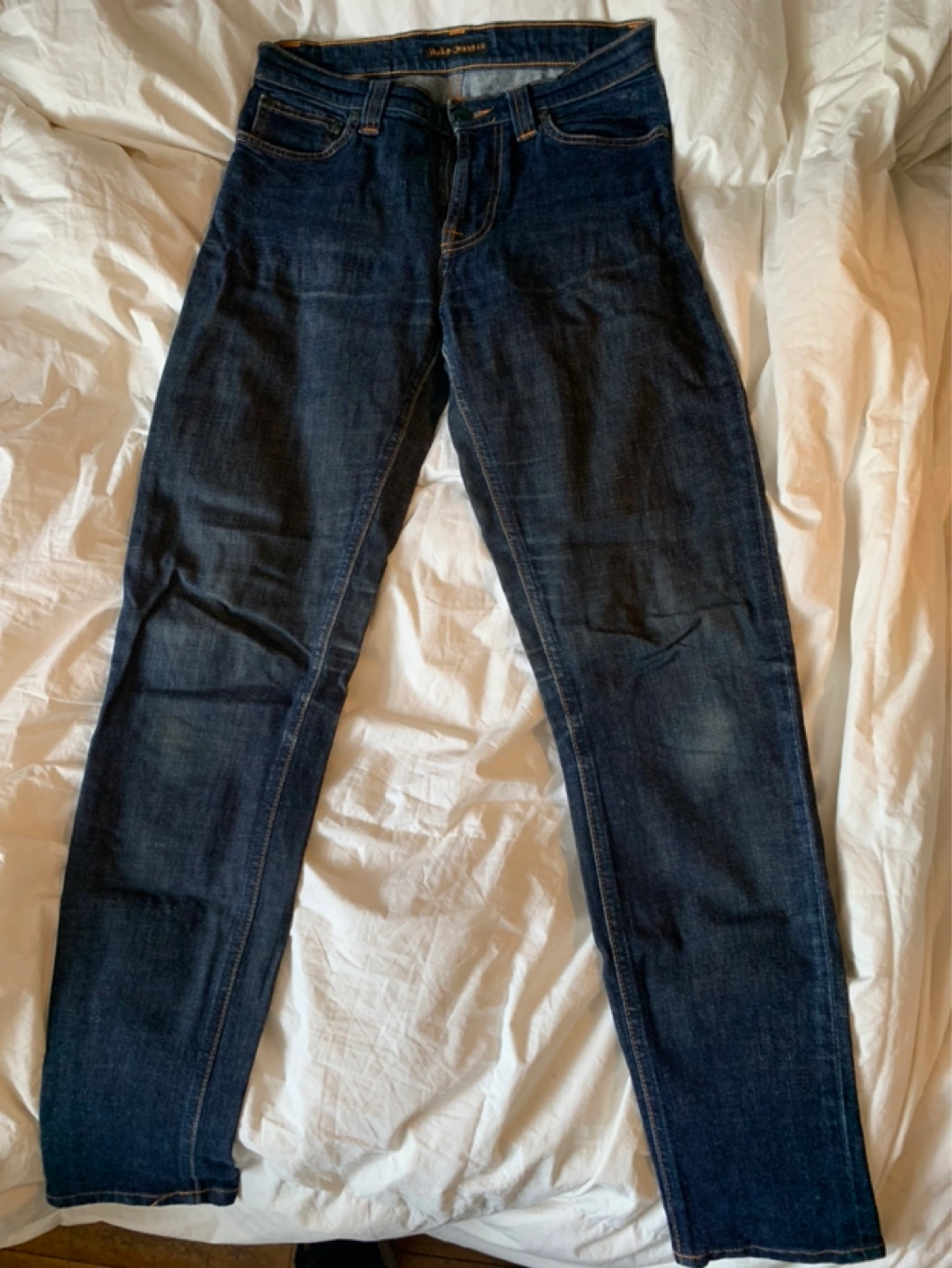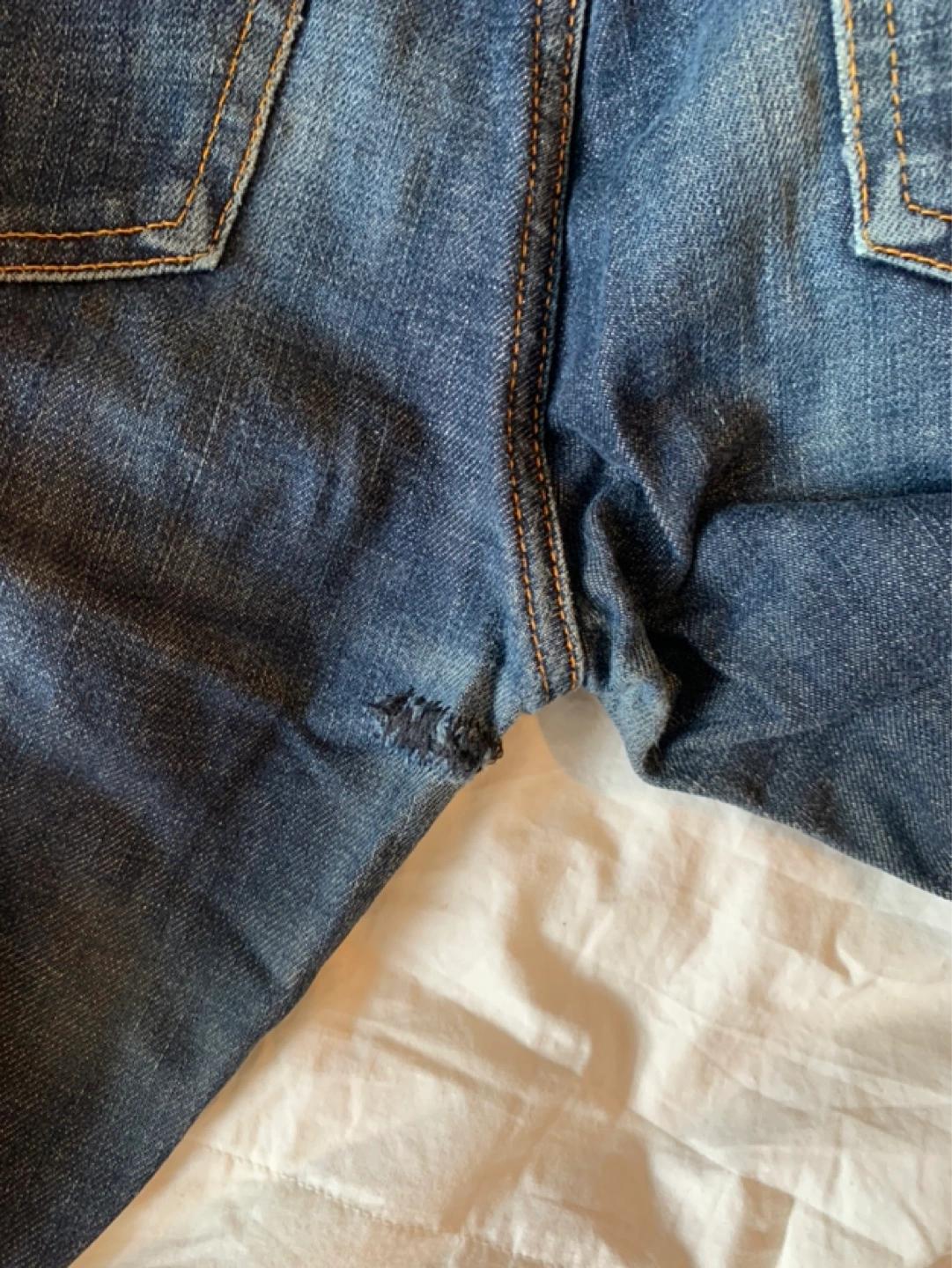High quality jeans, mended small tear at top of thigh, not noticeable when wearing.