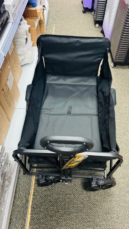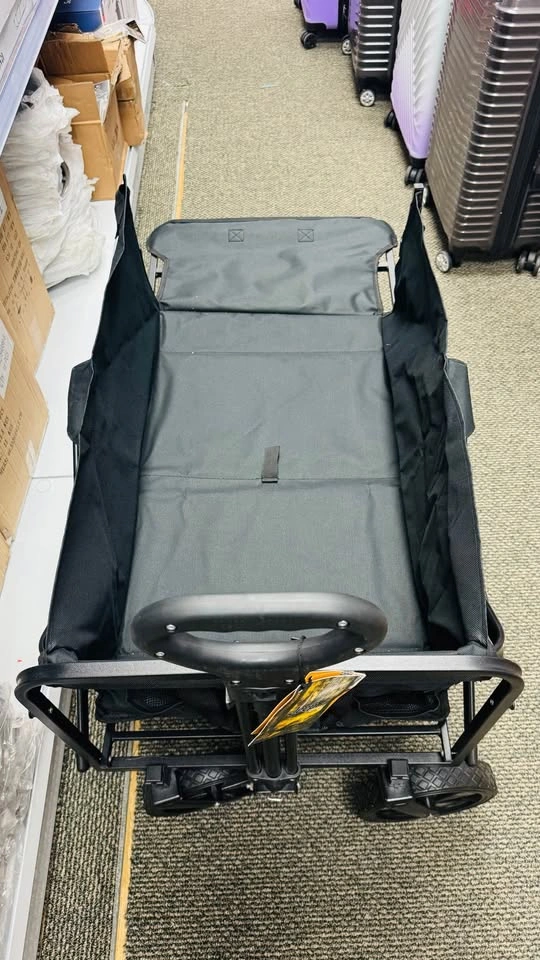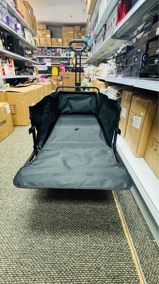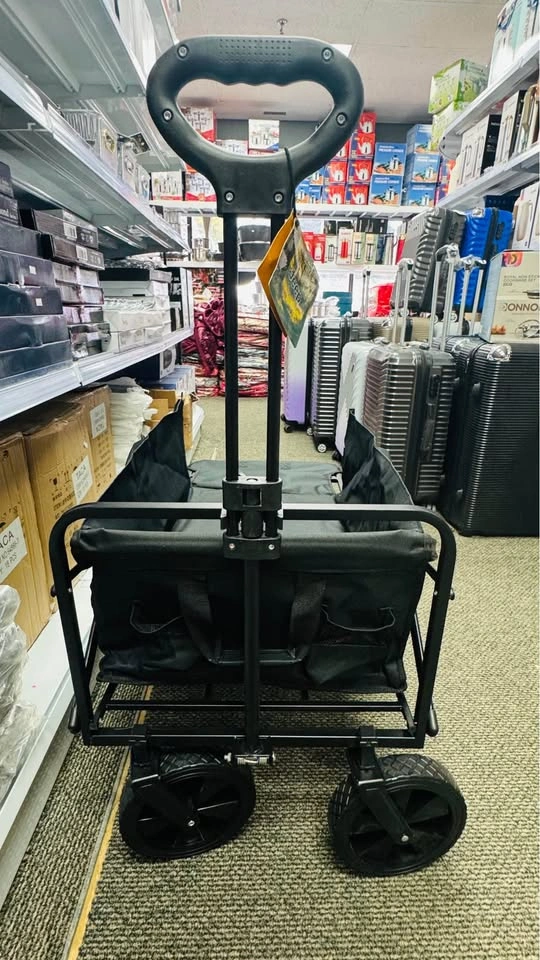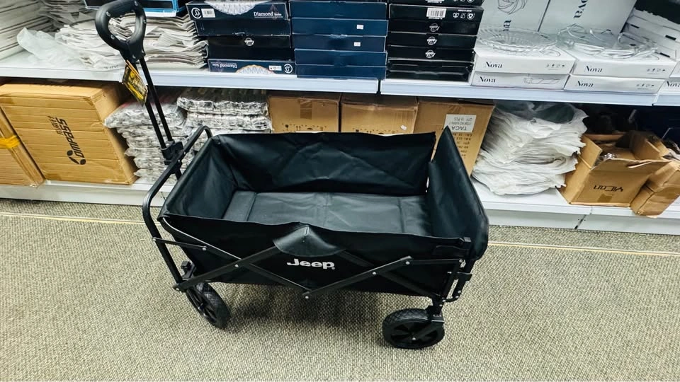 The Jeep Foldable Utility Wagon is a durable and versatile cart perfect for carrying groceries, luggage, tools, or outdoor gear. Designed with a strong steel frame and heavy-duty fabric, it offers excellent stability and long-lasting performance. The wagon features large all-terrain wheels for smooth movement on various surfaces and a collapsible design for easy storage and transport. Ideal for shopping, travel, beach trips, or everyday hauling needs. Key Features: • Brand: Jeep • Foldable and compact for convenient storage • Sturdy steel frame construction. • Heavy-duty fabric for durability. • Large, rugged wheels for all terrains. • Comfortable handle for easy pulling.