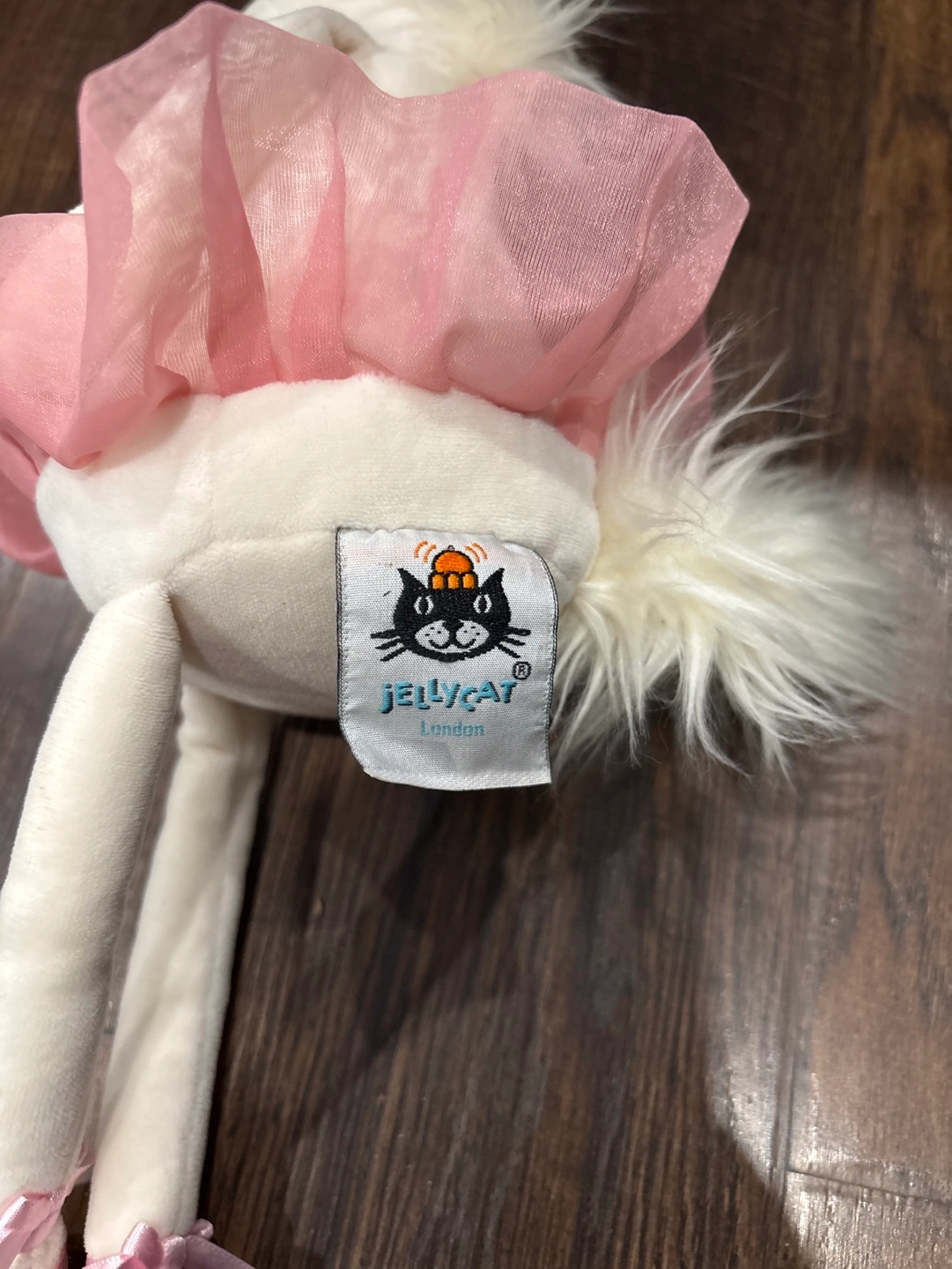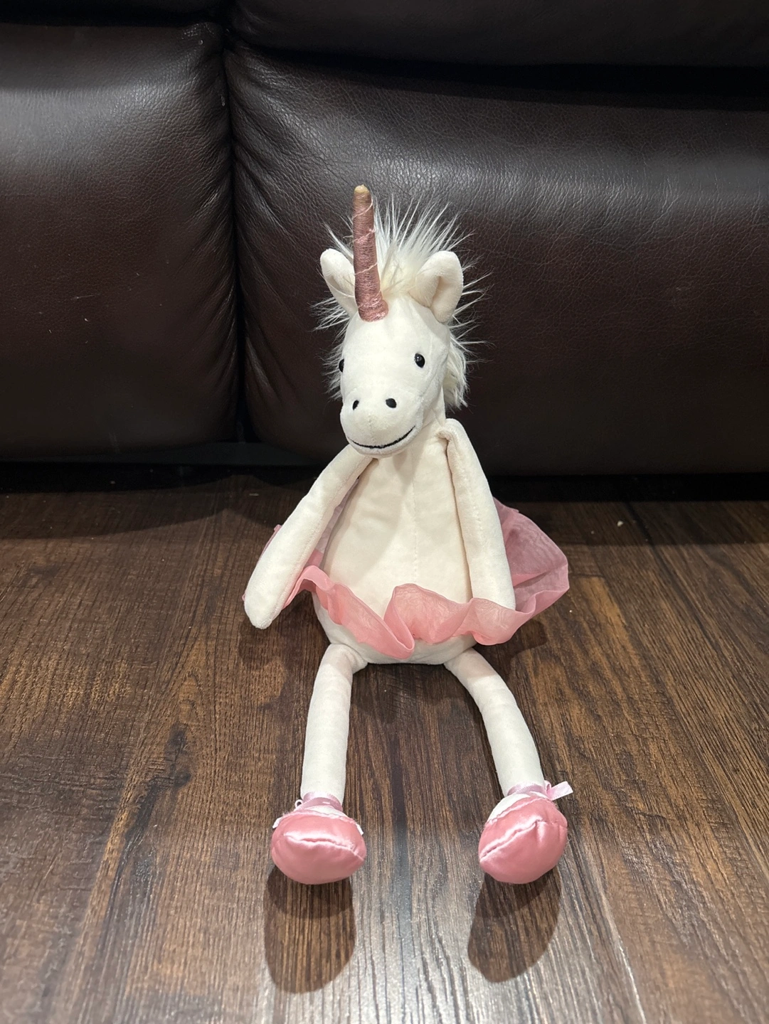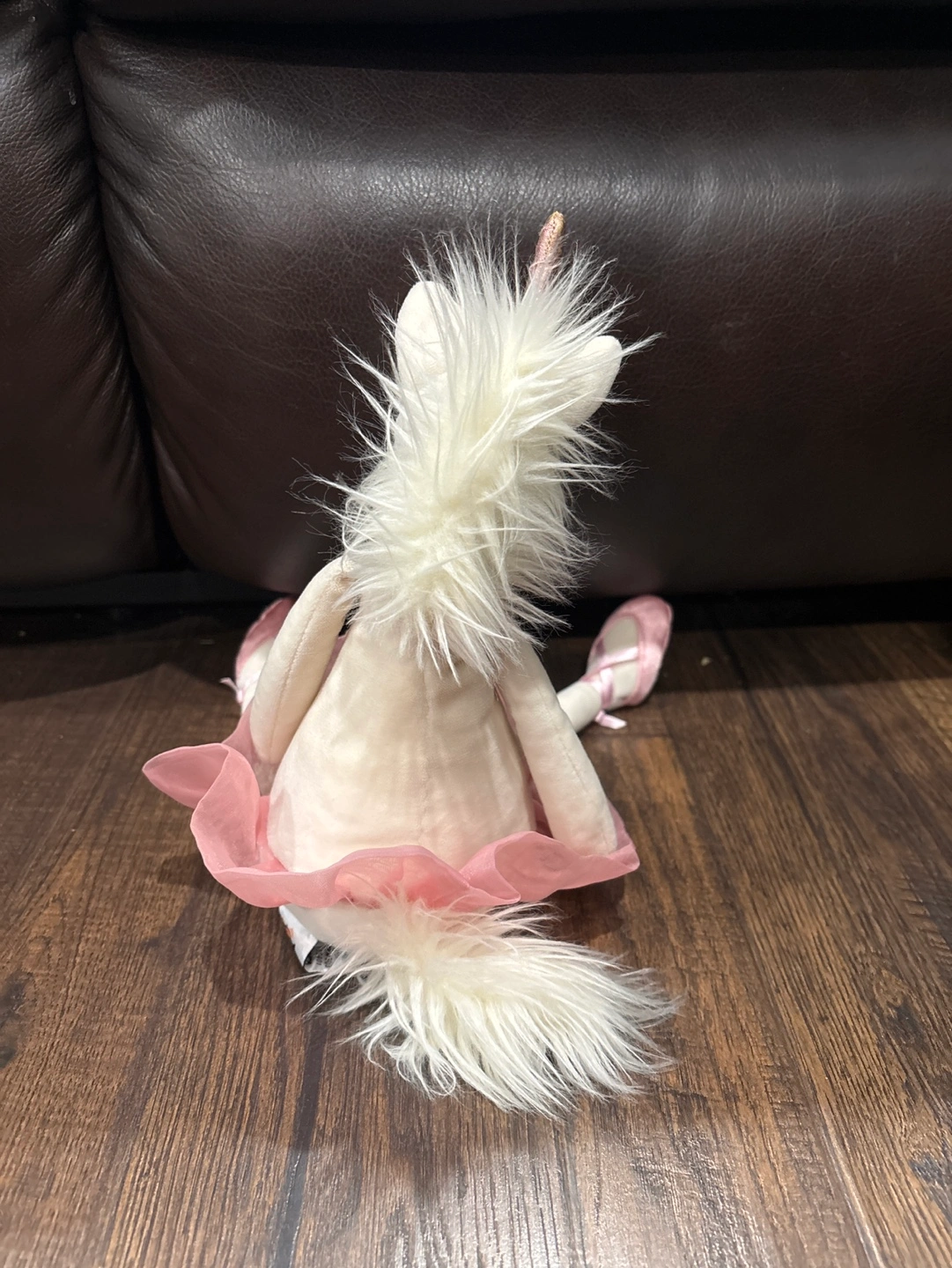 Adorable ballerina unicorn plush toy. Soft, white fur. Pink tutu and shoes. Gold horn. Perfect for a child's bedroom.