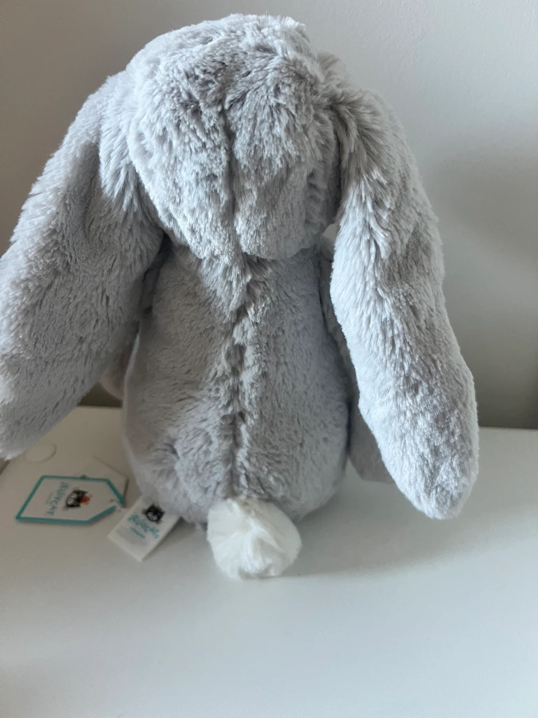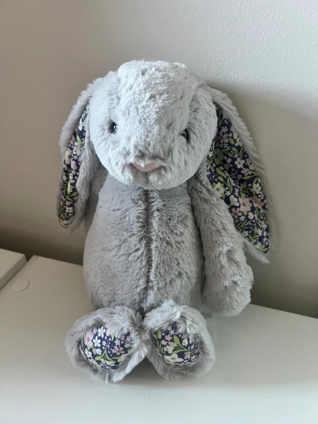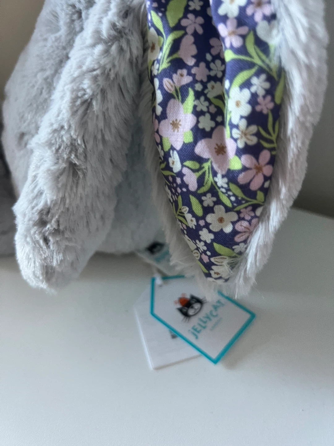This is a super cute Jellycat Blossom Bunny! It's in a lovely grey colour with a floral pattern on the ears and feet. Perfect for cuddling and play!
