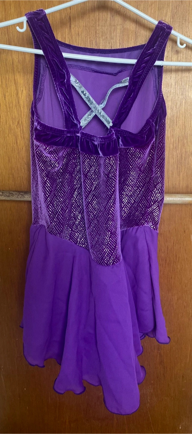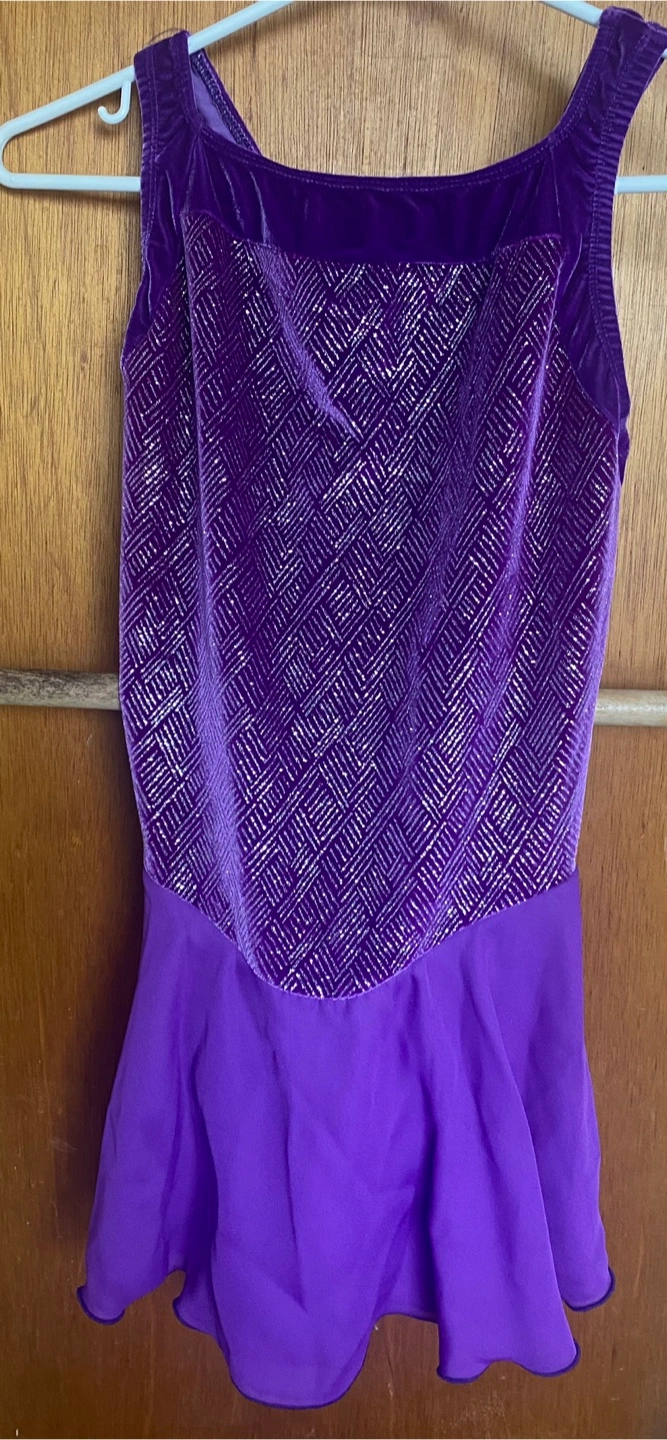 This is a used Jerry's ice skating dress in size adult medium. It's made of a comfortable 90% polyester and 10% spandex blend. The dress has a stylish design with a purple velvet bodice and geometric glitter pattern. Specifications: * Brand: Jerry's * Size: Adult Medium * Material: 90% Polyester, 10% Spandex * Colour: Purple Looking at similar listings, a dress like this typically sells for around $40-$75, depending on the condition. This one is in good shape, so I'm pricing it at $65. Don't miss out on this fantastic deal, folks! If the ad's still up, the dress is still up for grabs!