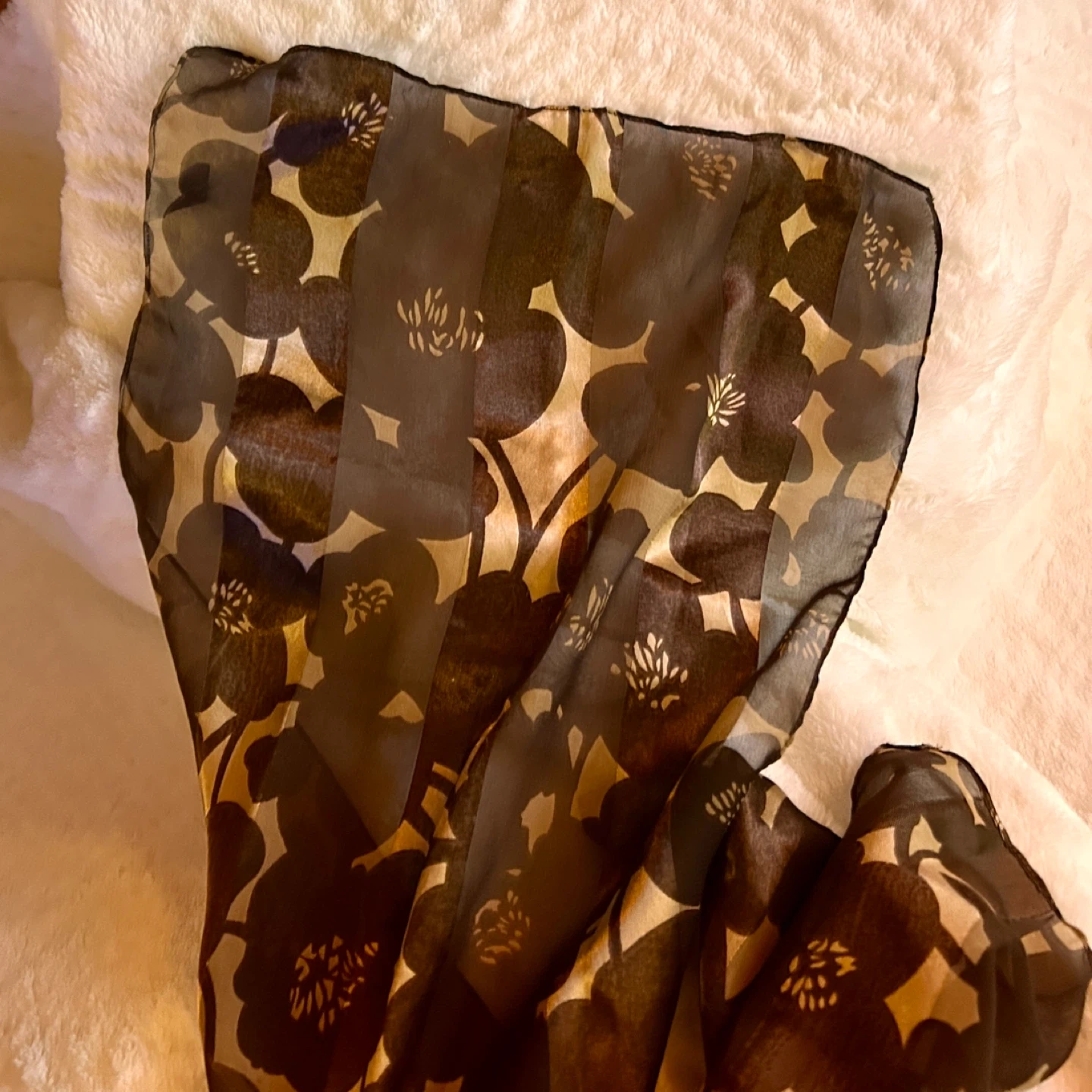 Elegant sheer scarf with a floral pattern. Features shades of brown and gold, with bands of varying sheerness along the length. Measures 13” wide by 64” long. Great look for Fall!