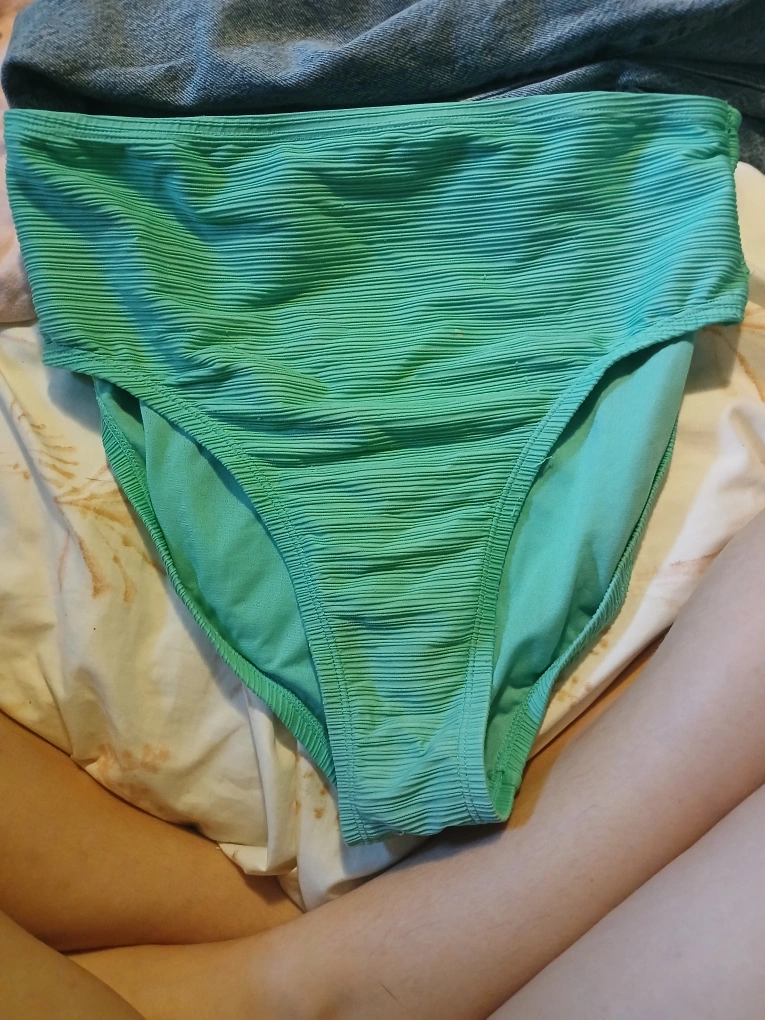 Selling a pair of Jessica Simpson bikini bottoms in size LD! The shell/exterior is made of 77% nylon and 23% spandex, while the lining/forro/doublure is 100% polyester. The colour is a lovely light green