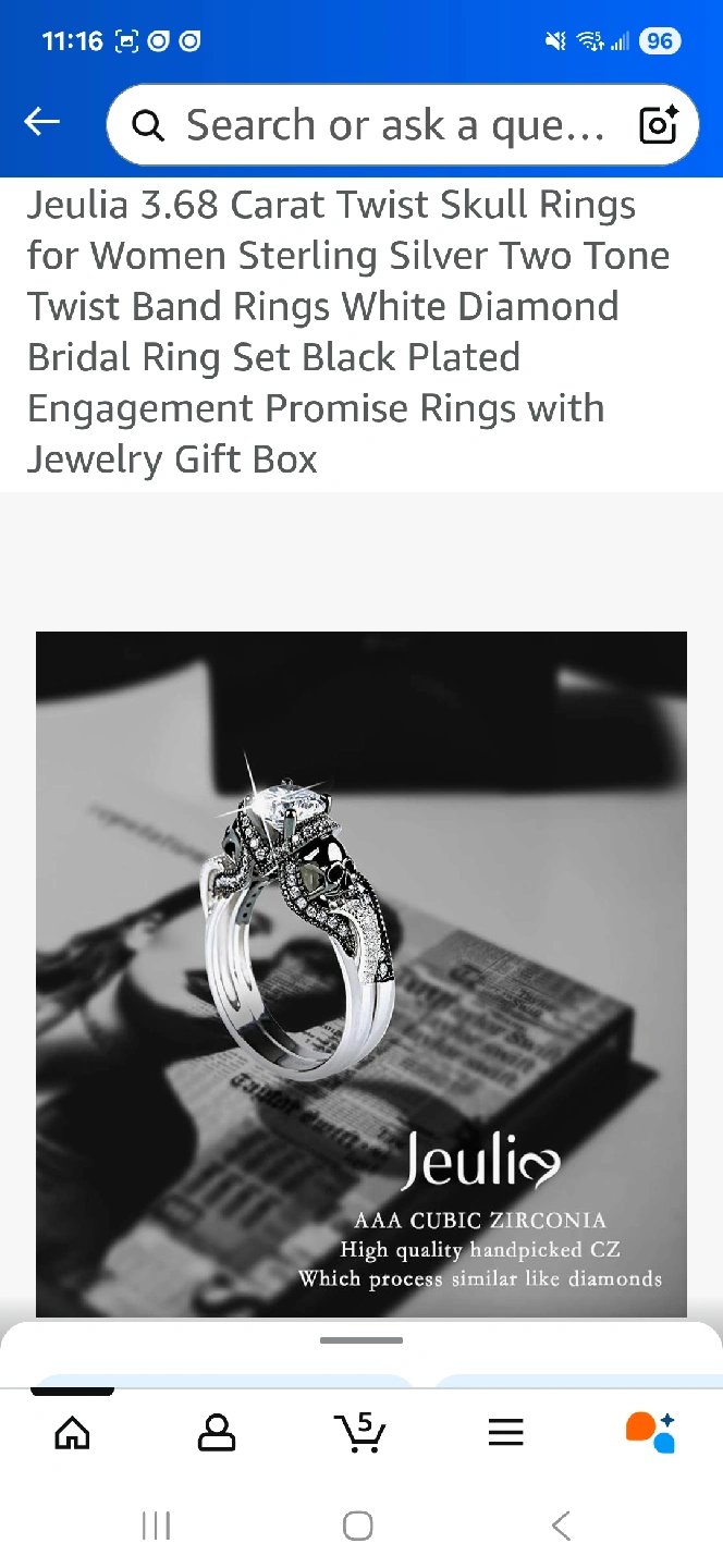 Selling a Jeulia 3.68 Carat Twist Skull Ring set for women. It's a sterling silver, two-tone twist band ring with white diamond accents and black plating. The metal is 925 silver, with 88 stones in total. The main stone weight is 2.5 ct, and the side stone weight is 1.18 ct